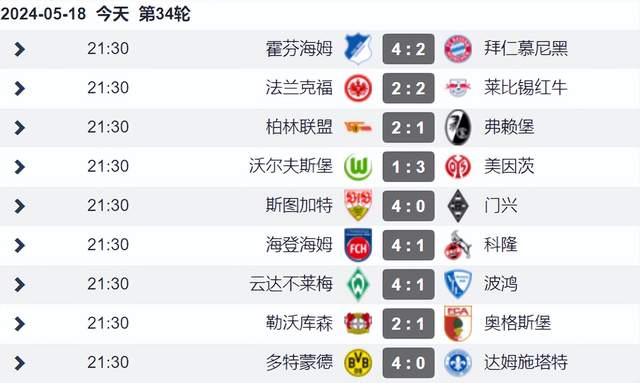 北京时间5月18日晚上21:30,德甲2023-24赛季的收官战、第34轮的9场比赛同一时间打响,结果是热闹极了。