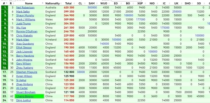 2026最新单赛季排名如下(香港赛结束后前十六参加球员锦标赛)
