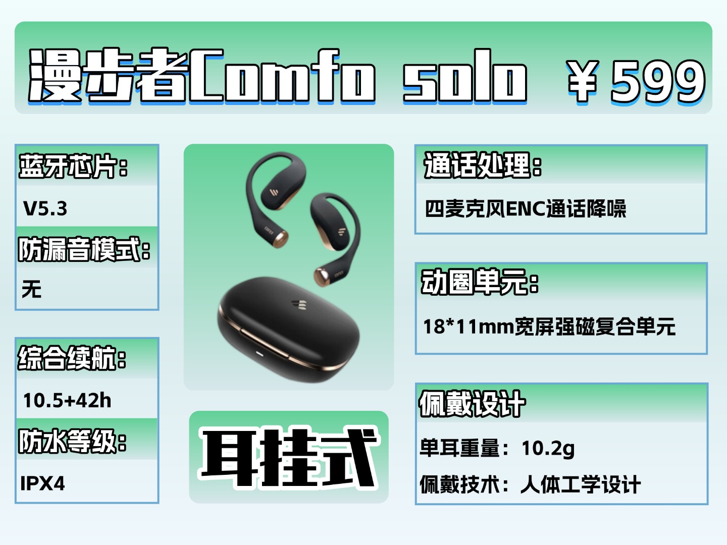 重量配比做的还不错,比较适中,耳机单耳只有8.9克的重量,耳朵在佩戴时的感受很小;耳机的稳固性上,创新的140°三角稳固力学设计搭配 C 形桥结构,可以紧紧贴合耳廓,就算在运动过程中,也不用担心耳机会掉。