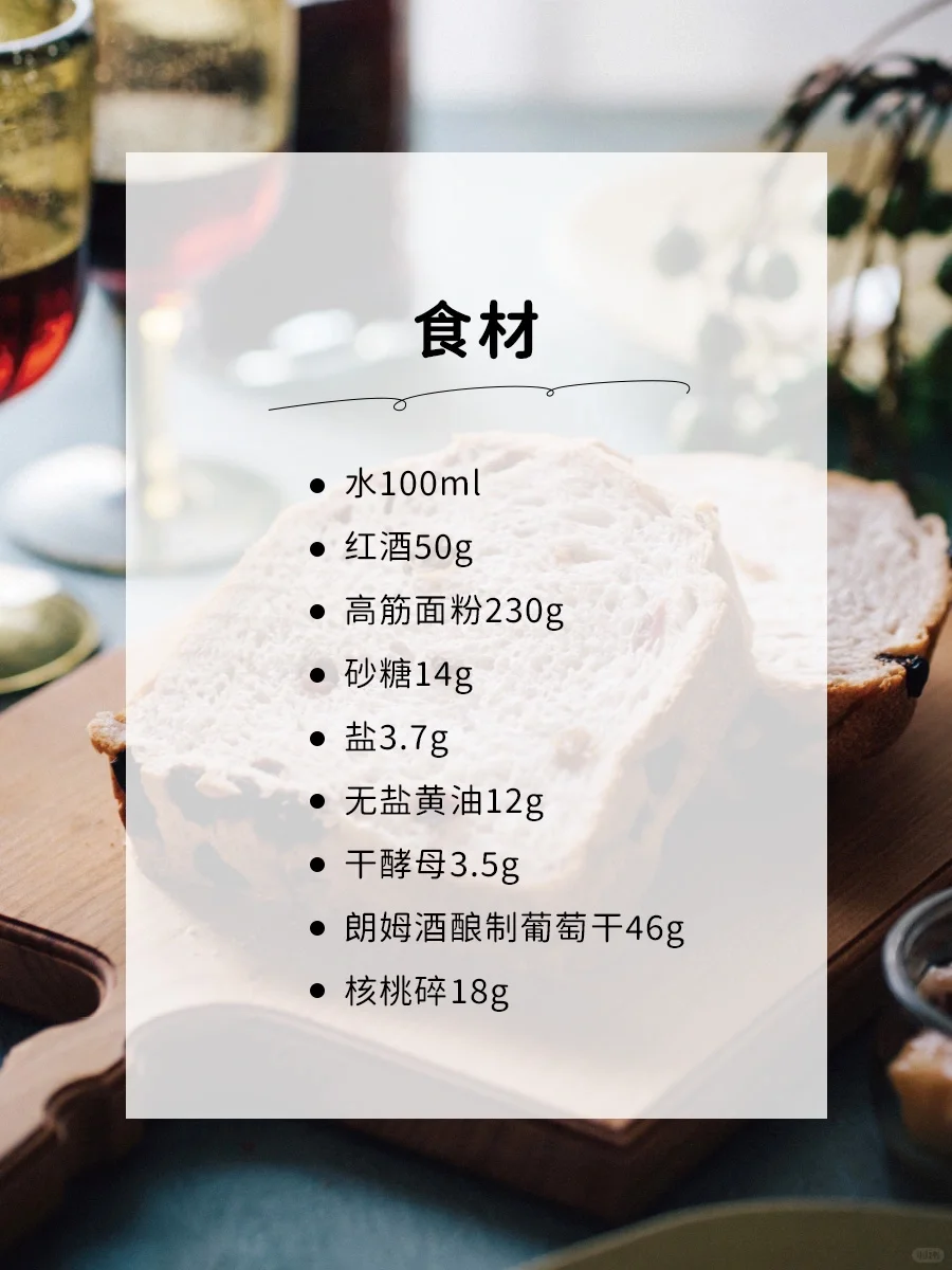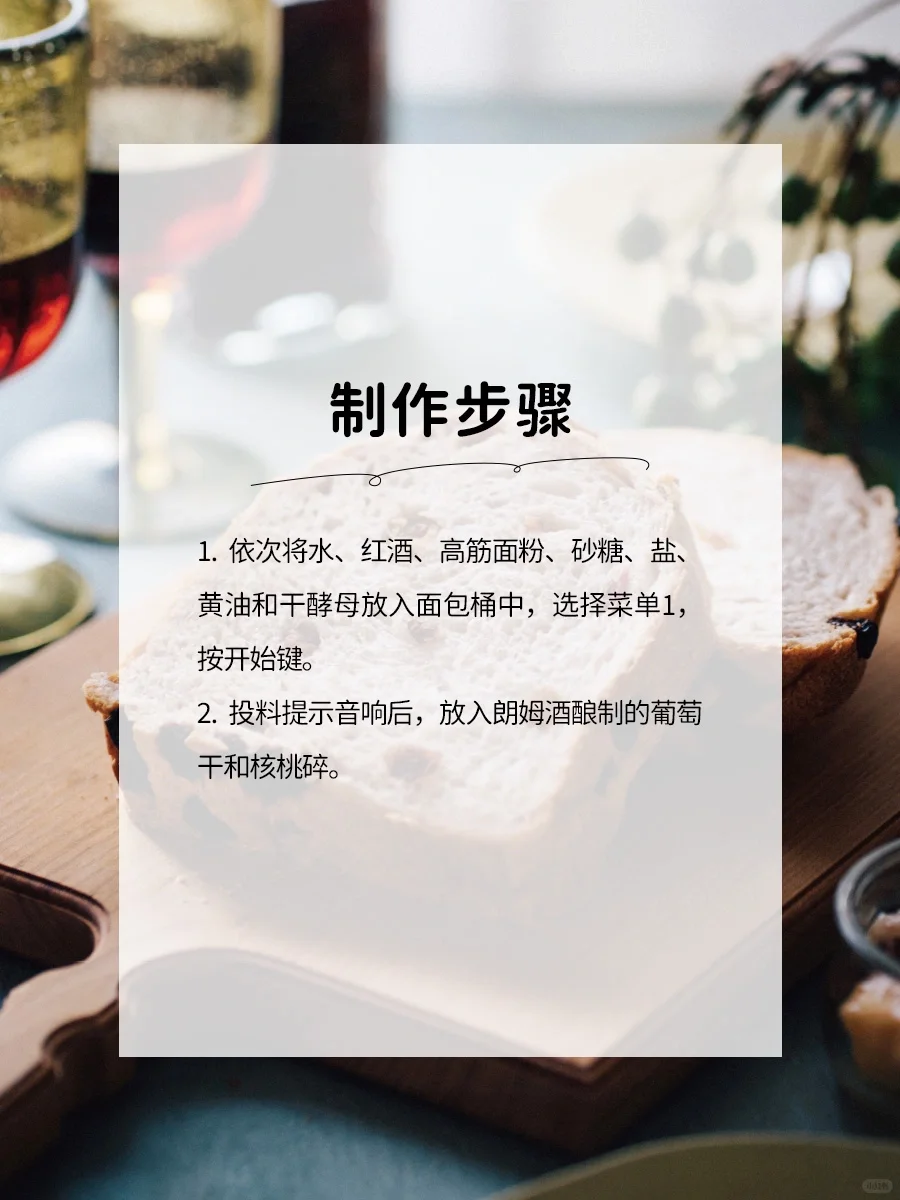 1. 依次将水、红酒、高筋面粉、砂糖、盐、黄油和干酵母放入面包桶中,选择菜单1,按开始键。