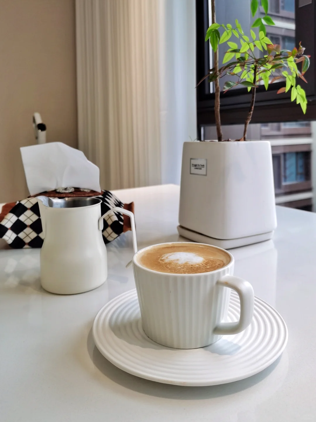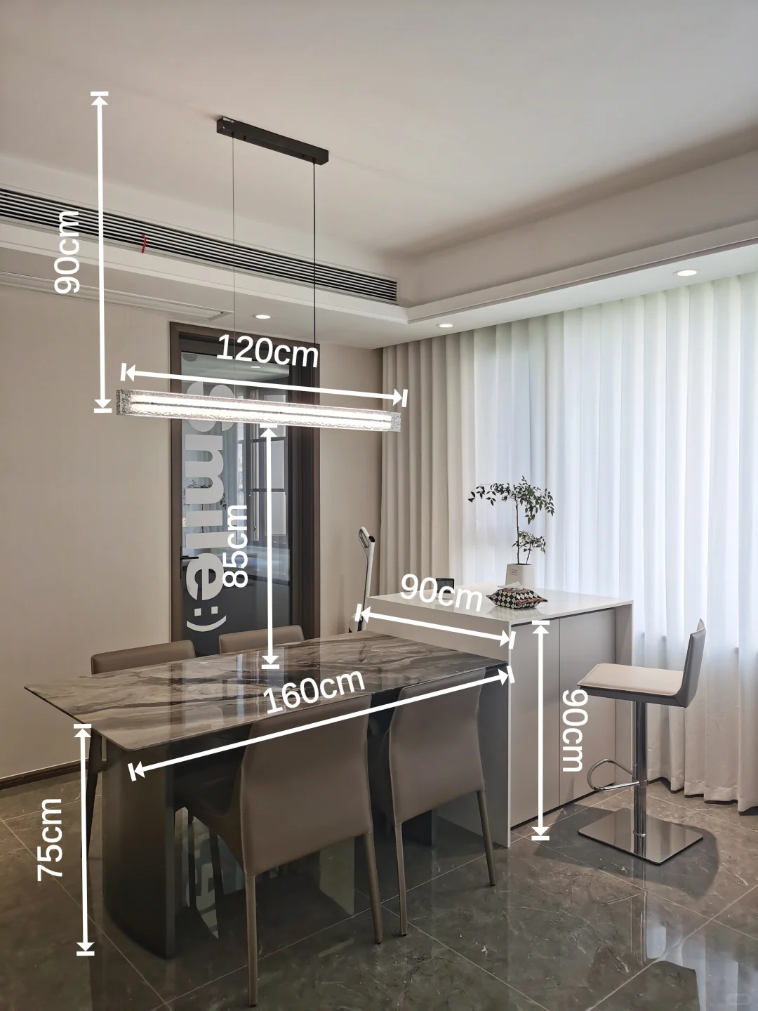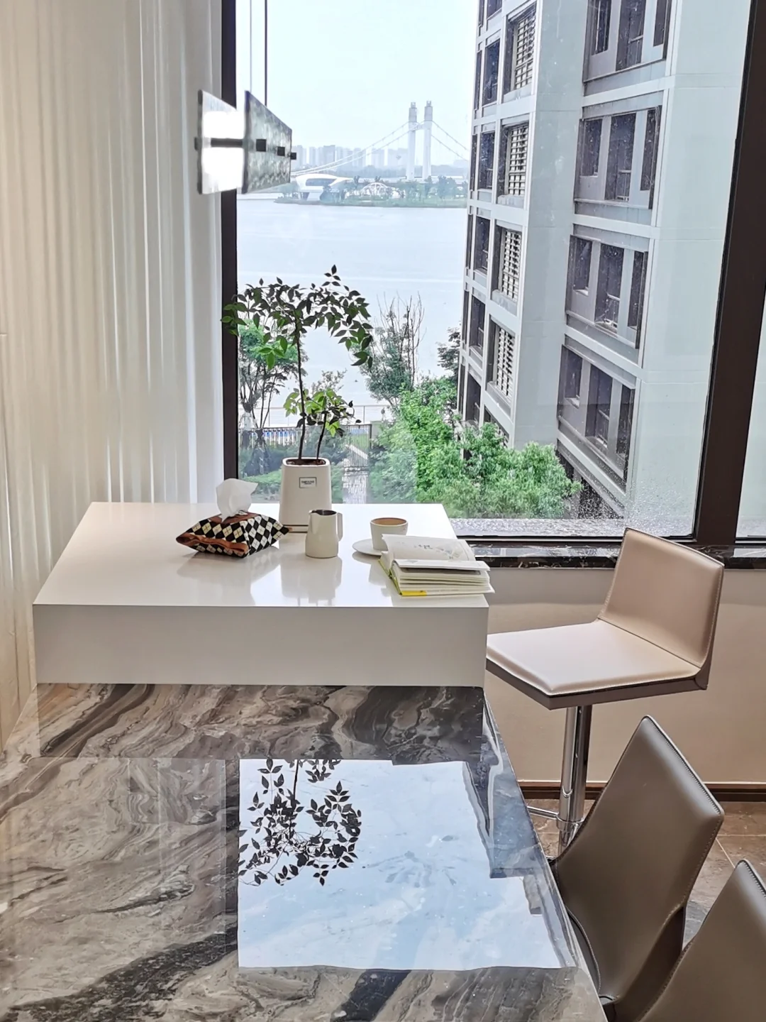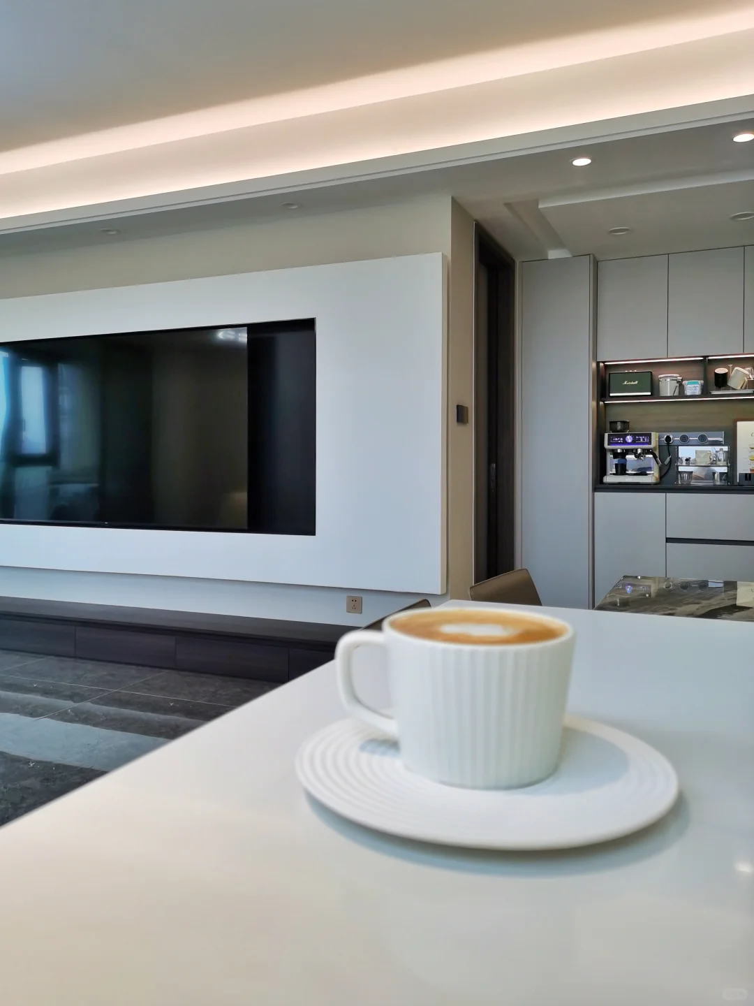 🏠早在收房之初,我便构想在窗边打造一个精致的岛台。 [清单R]最终,我们选择了餐岛分体式的设计,威尼斯棕的餐桌与纯白石英石台面的搭配,餐椅与吧台椅则选用了同一种马鞍革材质,既保证了整体的和谐统一,又和家里其他软装色调很呼应。对于这样的餐厅设计,我还是挺满意,无论是从颜值还是实用性上,它都达到了我的预期。 [啤酒R]每当闲暇时,坐在这个角落,享受一杯香浓的咖啡,感受生活的美好。