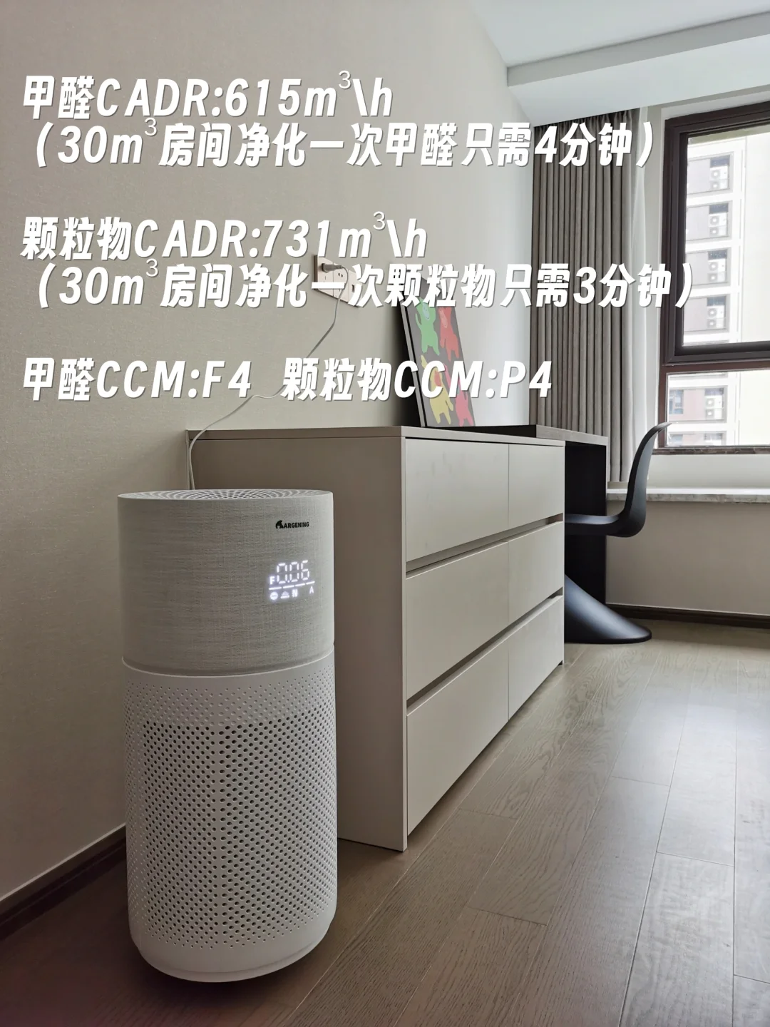 [打卡R]体积小巧,但净化能力不容小觑甲醛CADR:615m³\h (30m³房间净化一次甲醛只需4分钟);颗粒物CADR:731m³\h (30m³房间净化一次颗粒物只需3分钟);甲醛CCM:F4;颗粒物CCM:P4。(两项都是达到了醉高级)此外,锥形水滴孔的设计特别考虑了宠物毛发的清理,高效吸附且防止二次污染。