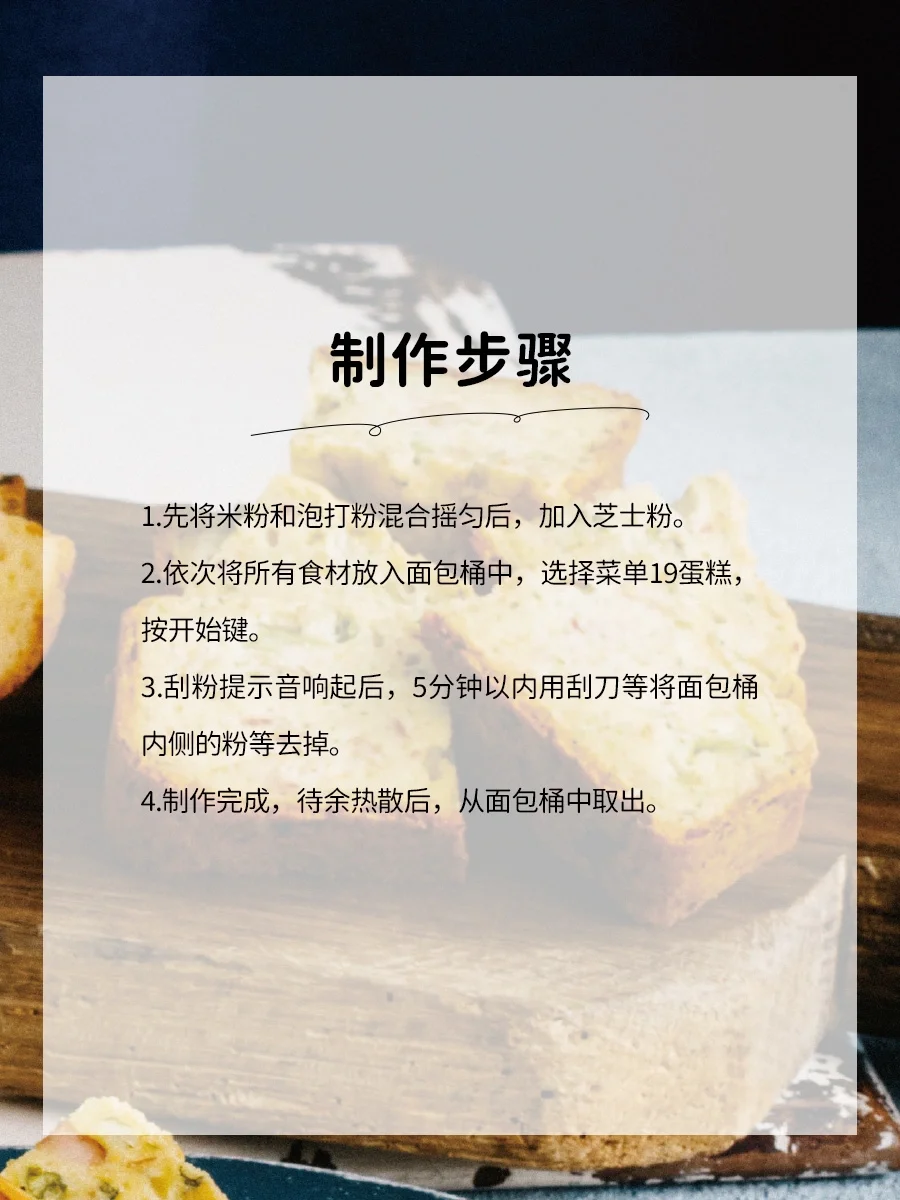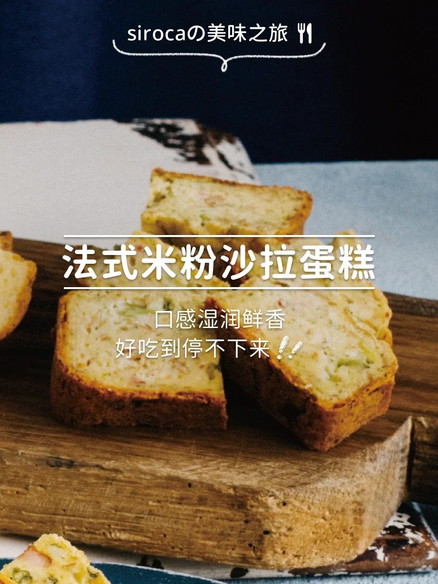 今天教你解锁西罗卡面包机一机多用 吃腻了单调的白吐司🍞 口感丰富的蛋糕🍰也能轻松制作 法式米粉沙拉蛋糕,口感湿润鲜香 是午后甜点,也是brunch美味配餐✨ - 📝食材 橄榄油35g 搅匀的蛋液150g 豆奶40g 砂糖4g 盐1g 胡椒适量 米粉150g 泡打粉6g 芝士粉30g 西兰花(切小块)80g 香肠(切小块)4-5根 - 📝制作 1.先将米粉和泡打粉混合摇匀后,加入芝士粉。 2.依次将所有食材放入面包桶中,选择菜单19蛋糕,按开始键。 3.刮粉提示音响起后,5分钟以内用刮刀等将面包桶内侧的粉等去掉。 4.制作完成,待余热散后,从面包桶中取出。 - 🌟食谱中使用的产品 siroca家用速烤轻食面包机