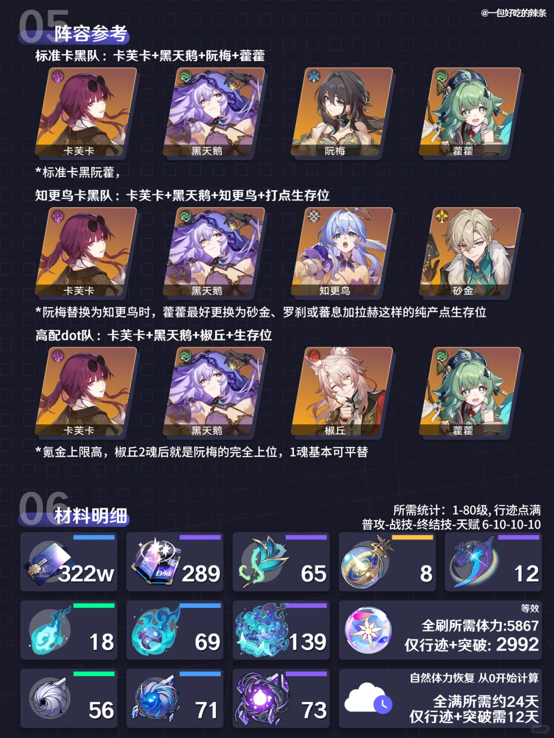 大家好,这里是一包好吃的辣条! 本期带来的是『黑天鹅』的复刻培养指南 dot队全队一图流培养在主页哦~ ————————————— 如有遗漏/错误欢迎指出,共同进步~ 最近新玩家/回坑玩家多,大家友善讨论哦~ —————————————