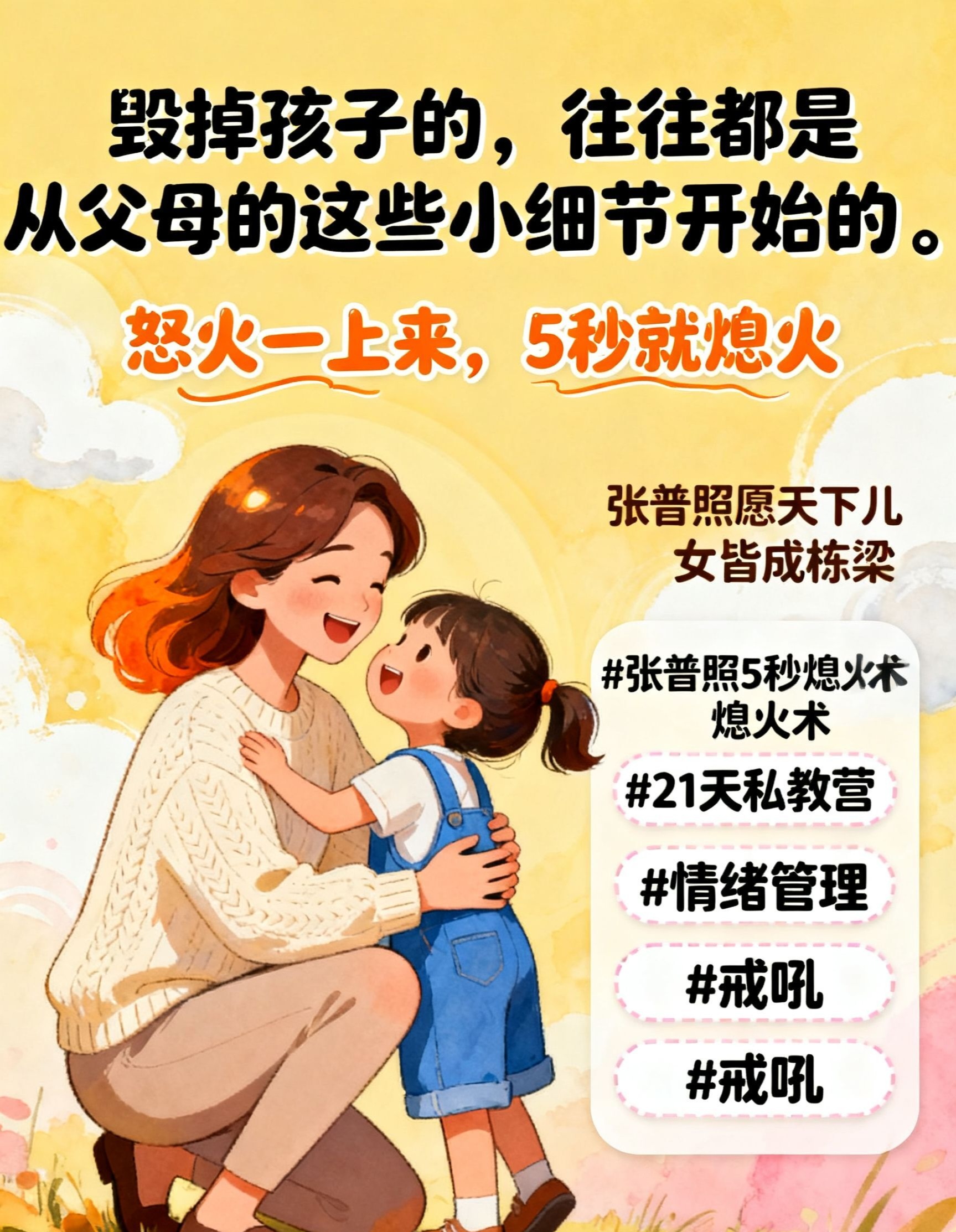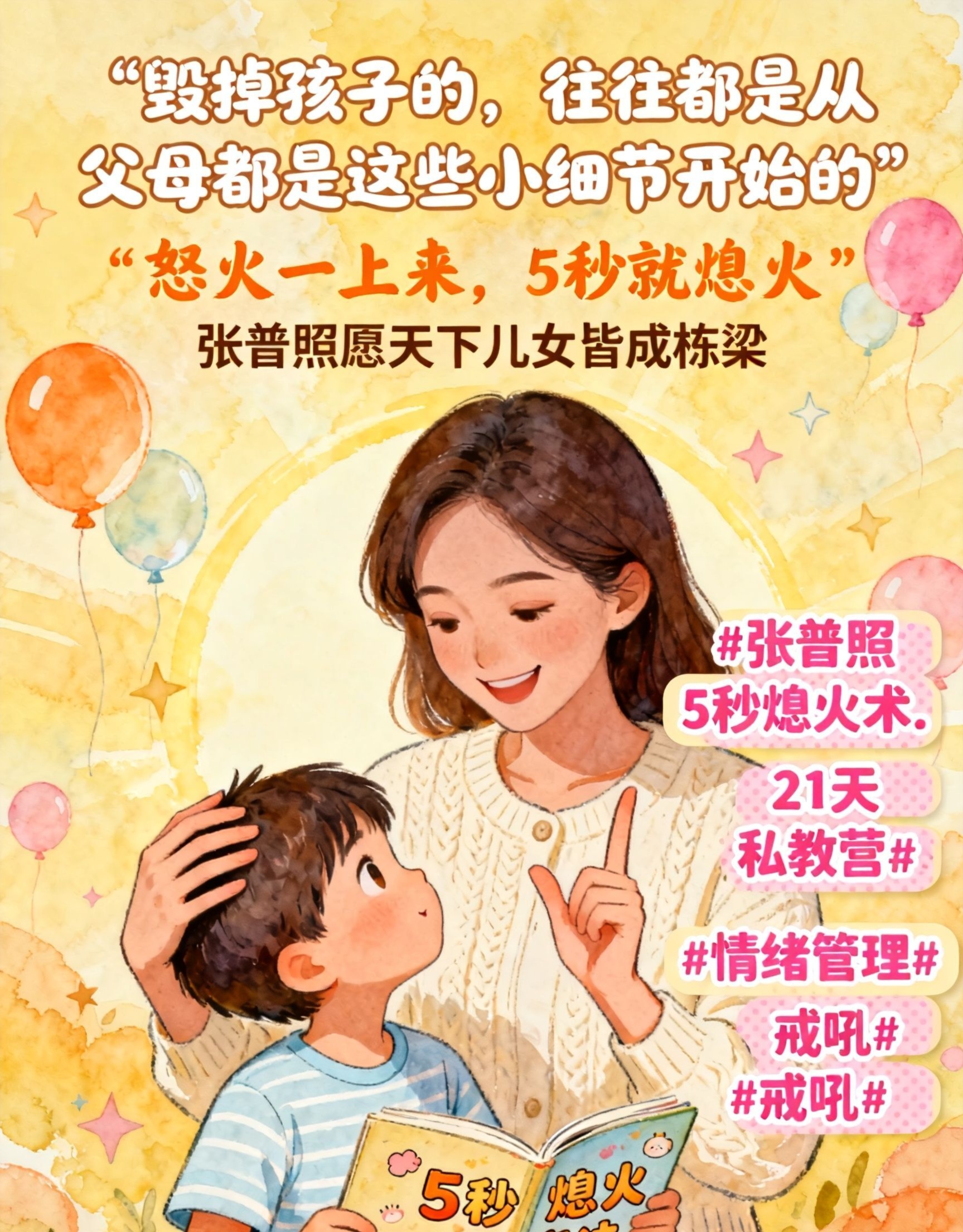 ‘张普照5秒熄火术’,就是赋予你这种 瞬间自我掌控能力 的根本。 在你即将被情绪支配,做出又一个伤人“小动作”的 关键时刻,给你 一次关键的‘清醒’。父母先能靠5秒熄火术管住情绪的‘微泄露’,才是对孩子最细微、也最深刻的保护。”