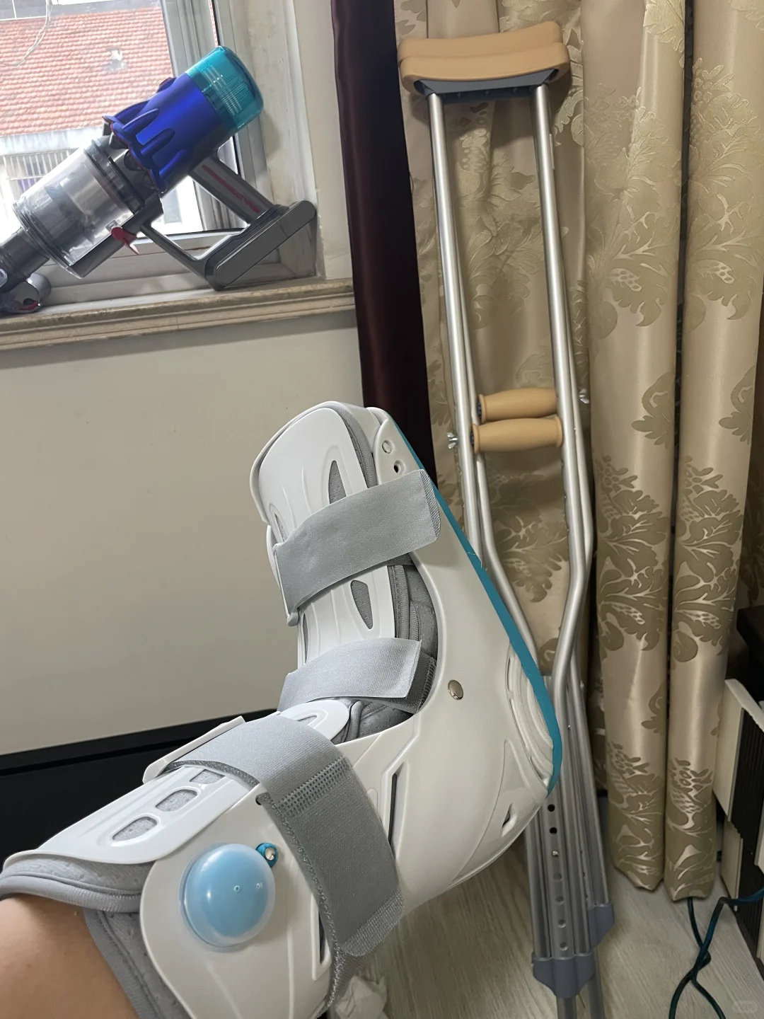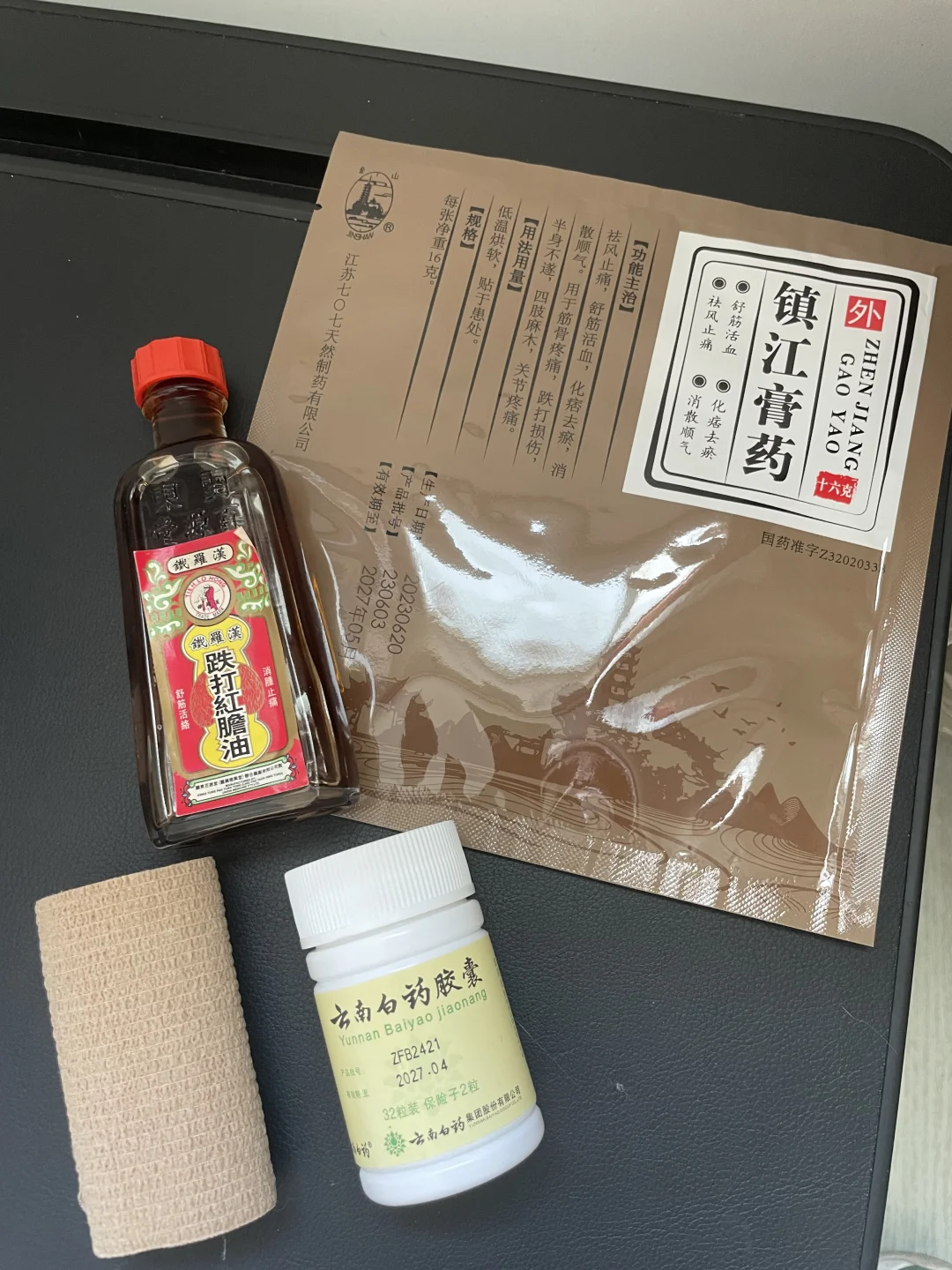 一脚踏空之后,在家贴膏药躺了半天,感觉脚面外侧的筋很痛,晚上睡觉的时候脚面很痛,老师说要去拍个片子,因为骨折有滞后性。 第二天一个人拄着根健身的棍子去了医院,果然一处骨折一处骨裂,但是轻微的,感觉只有指甲盖的长度,裂的也不算太明显。京东下单的支具,医院门口买了副拐杖,回家继续贴膏药,今天是第四天,不理解为啥一到晚上就脚面疼,把膏药拆了一看,原来没贴膏药的前脚面肿老高,贴了膏药的地方消肿了,而且侧面靠脚踝的下面有一点点瘀血,刚好是膏药没贴到的地方,图片看得出膏药圆形的痕迹吗?!今天调整一下膏药的布局。 这个膏药是家门口一个祖传三代的骨科中医诊所也在用的同款,新款比老款好多了,老款是一张大红纸还得用打火机烧软才能贴,新款面积更大,还自带软贴纸,不需要打绷带了。 这几天每天都在吃云南白药,没错,用吃的,胶囊款,记住,里面那颗保险子不要吃,那是重大问题譬如突然撞车内出血这种,用来急救内伤的,普通问题不要吃,药酒是用来在换药的时候擦膏药的,狗皮膏药撕下来有残留,用这种药酒沾着纱布擦比较方便,比卸妆油方便