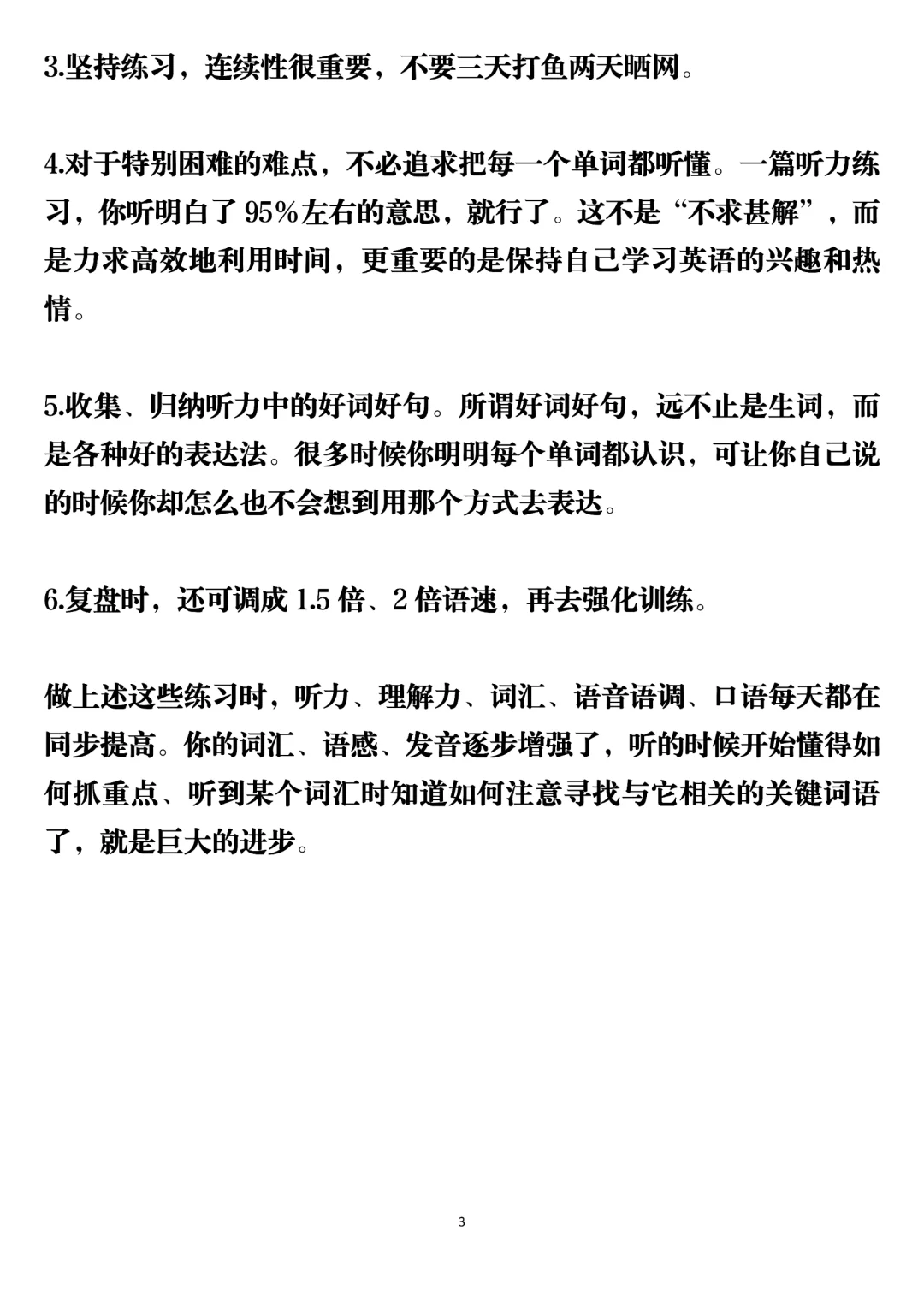 4.对于特别困难的难点,不必追求把每一个单词都听懂。一篇听力练习,你听明白了95%左右的意思,就行了。这不是“不求甚解”,而是力求高效地利用时间,更重要的是保持自己学习英语的兴趣和热情。