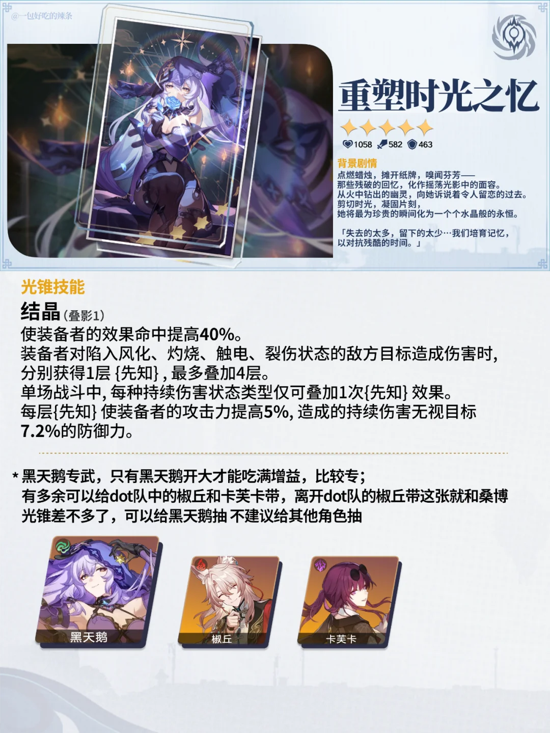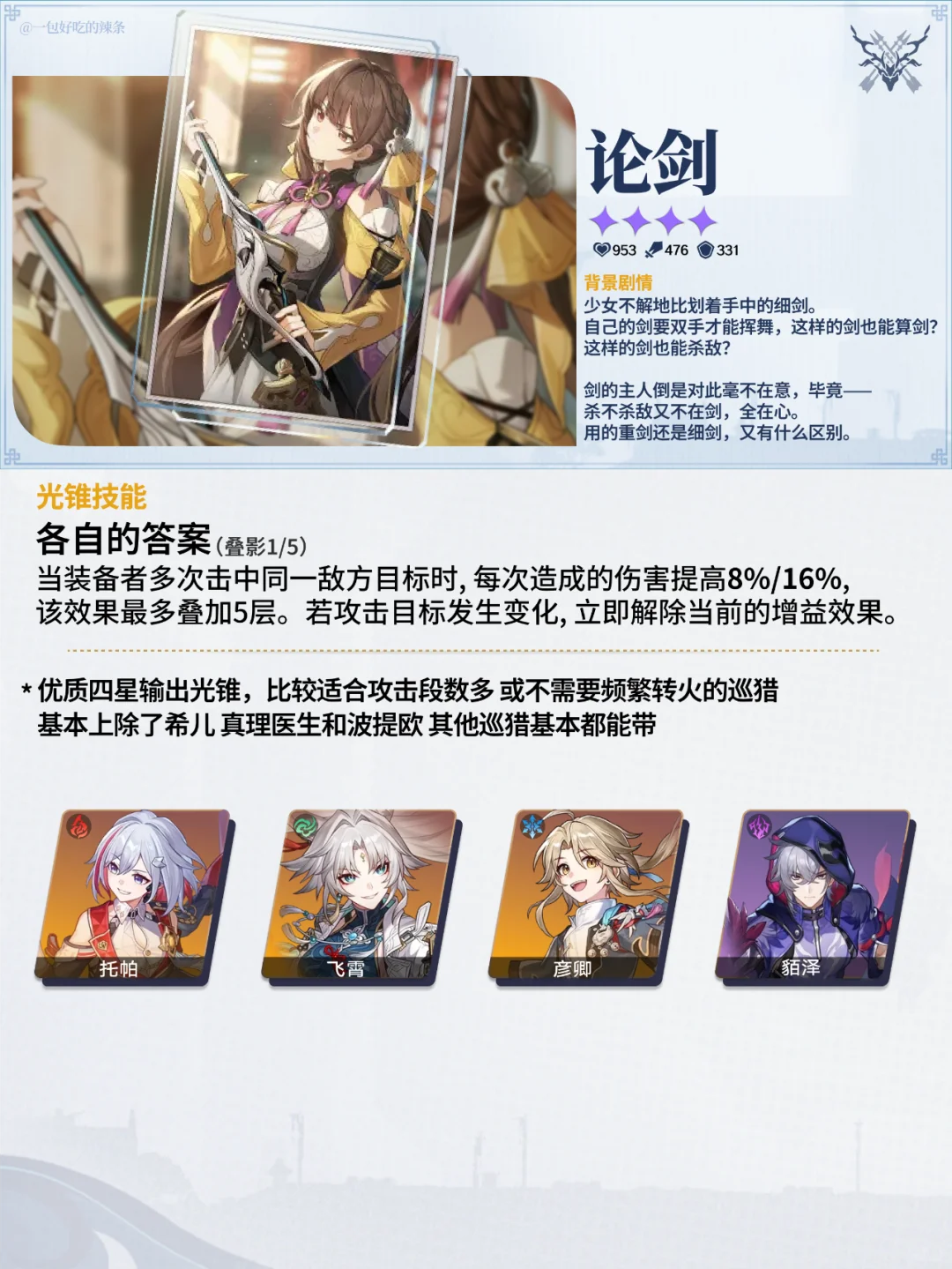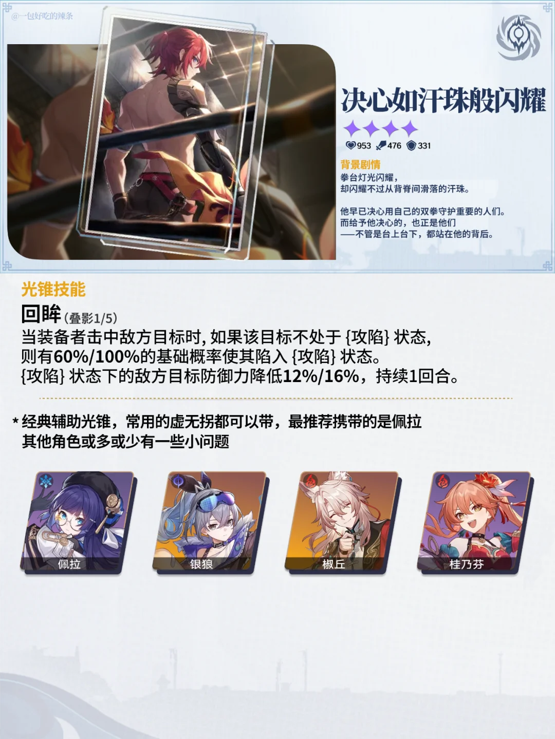 开拓者好呀,这里是一包好吃的辣条! 本篇带来的是2.5上半卡池光锥适用分析~ ————————————— 如有遗漏/错误欢迎指出,共同进步~ 最近新玩家/回坑玩家多,大家友善讨论哦~ —————————————
