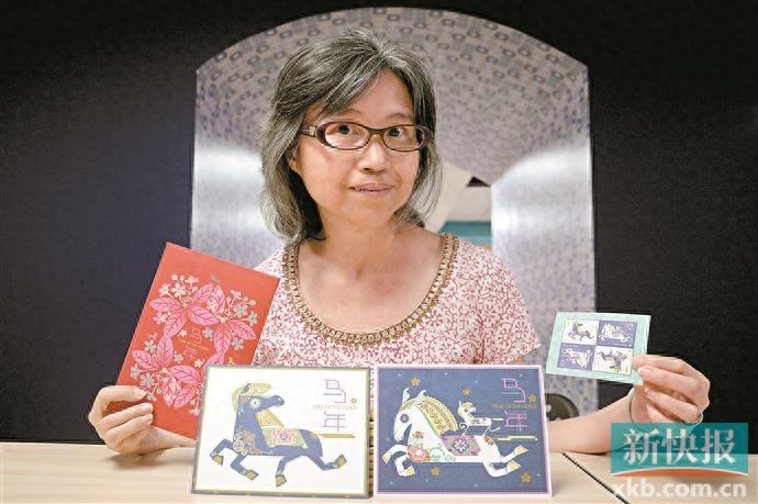 ■设计师林愿玲展示她设计的新加坡马年明信片与邮票。