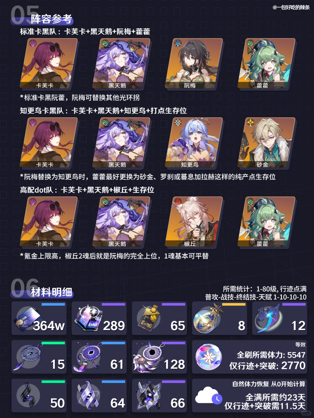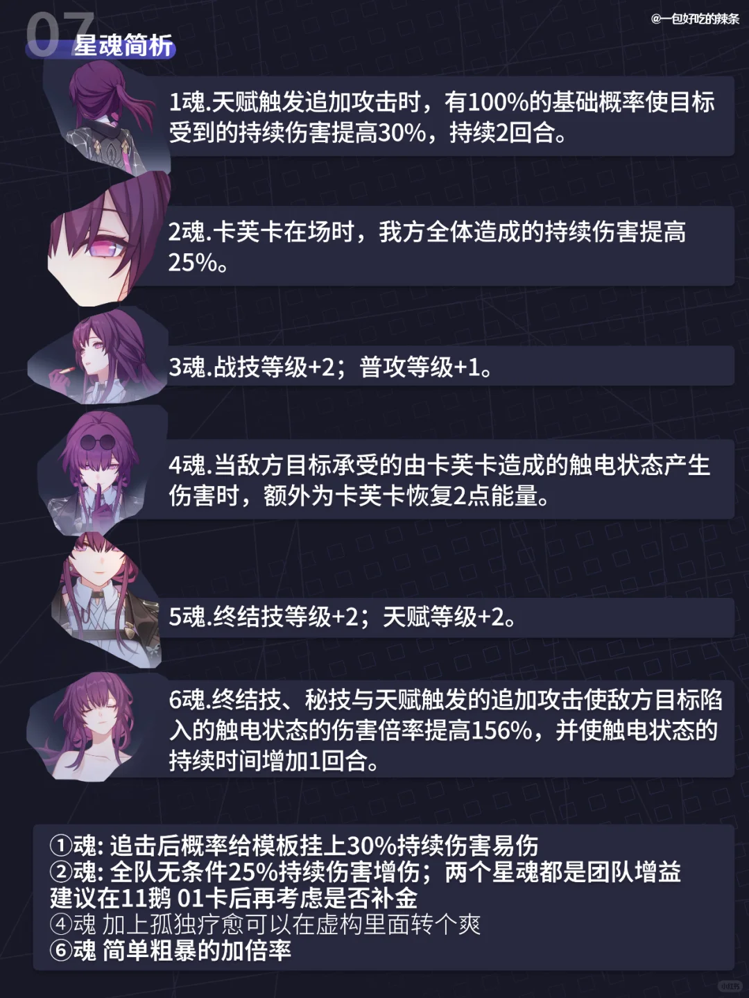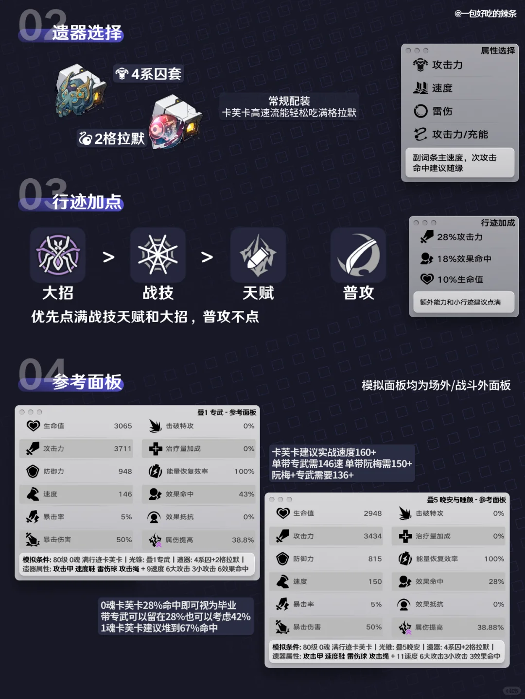 大家好,这里是一包好吃的辣条! 本期带来的是『卡芙卡』的培养指南 包括光锥、遗器、行迹、面板、配队、材料和星魂 ————————————— 如有遗漏/错误欢迎指出,共同进步~ 最近新玩家/回坑玩家多,大家友善讨论哦~ —————————————