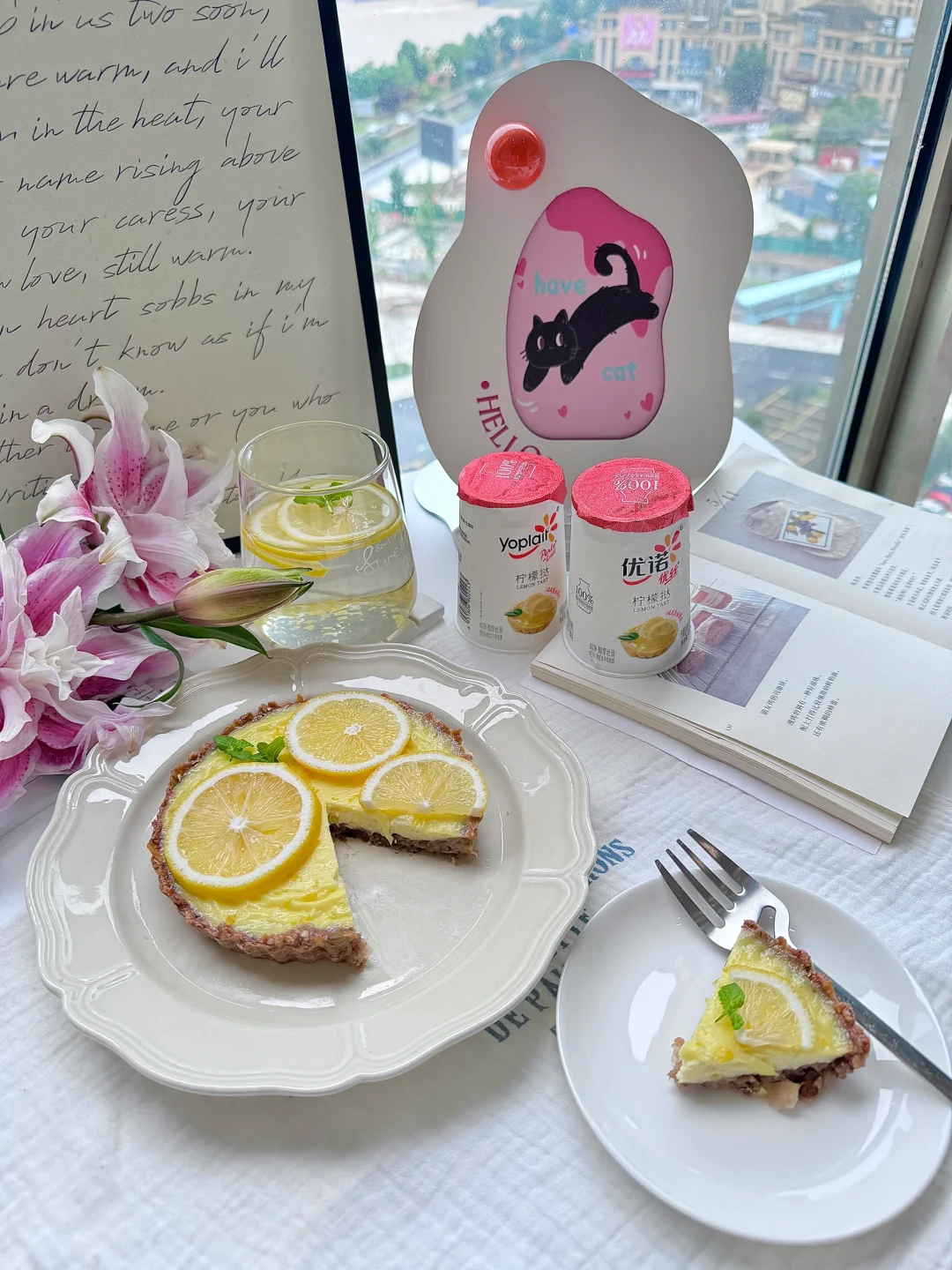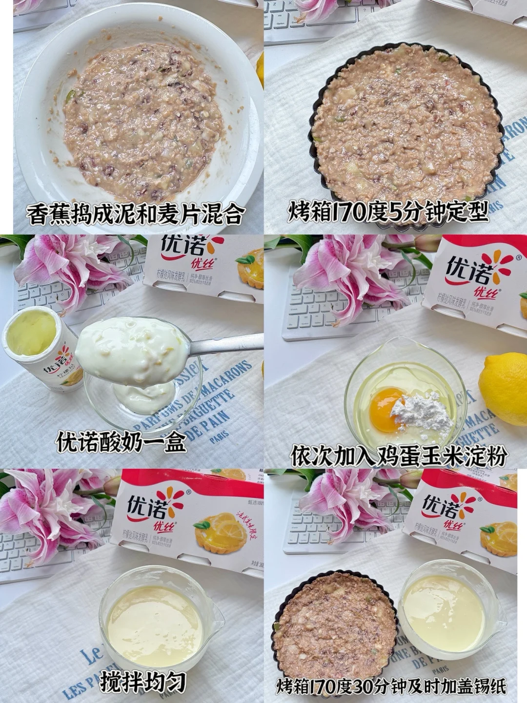 法式甜品 | 柠檬酸奶燕麦挞🥧无油无糖无面粉 冷藏后有点像芝士蛋挞内口感! 燕麦80g 香蕉一根酸奶 150g 蛋2个 玉米淀粉18g 柠檬半个 香蕉泥加燕麦拌成团 烤箱170度5分钟定型 酸奶依次加蛋玉米淀粉搅匀 优诺柠檬挞风味发酵乳自带柠檬,(加柠檬汁这步可以省去) 倒入挞壳 烤箱170度30分钟! 冷藏后食用更佳 优诺新出的柠檬挞风味酸奶!口感很清爽,里面还有柠檬粒,配料表很干净,囤一箱都不够喝[偷笑]