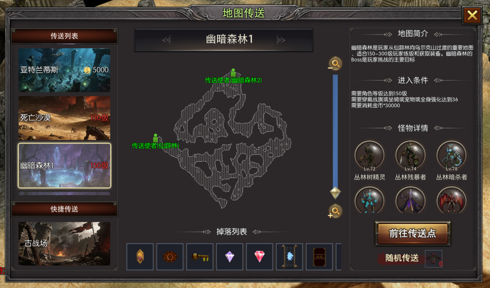 中后期刷怪圣地,幽暗森林是玩家从仙踪林向乌尔克山过渡的重要地图,适合150-300级玩家练级和获取装备。幽暗森林的Boss是玩家挑战的主要目标。