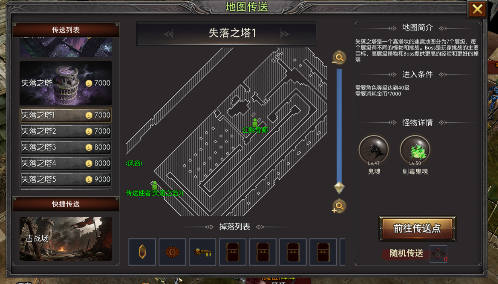 特点:七层试炼塔楼,每层难度递增。怪物:骷髅法师、塔卫。资源:产出高阶技能书、灵魂宝石、转职材料。技巧:七层终极BOSS掉落稀有套装图纸,建议固定队伍推进。