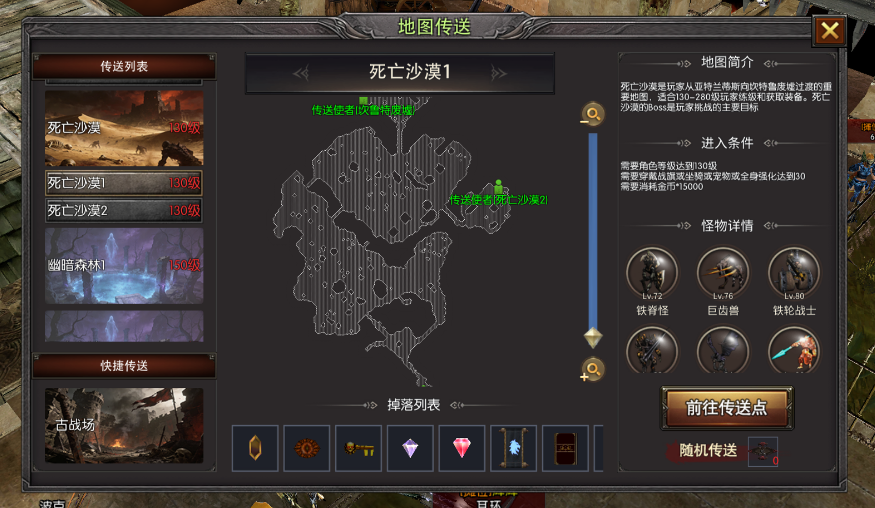 特点:荒漠与古代遗迹,130级解锁。怪物:沙漠盗匪、死神骑士、铁脊怪。资源:产出顶级合成材料(黑王马/天鹰灵魂)、终极技能书。隐藏点:每日12:00-14点阳光时段,在流沙陷阱边缘石碑前使用“沙漠之眼”道具,可激活传送门进入流沙秘域,经验丰厚且必掉灵魂宝石。