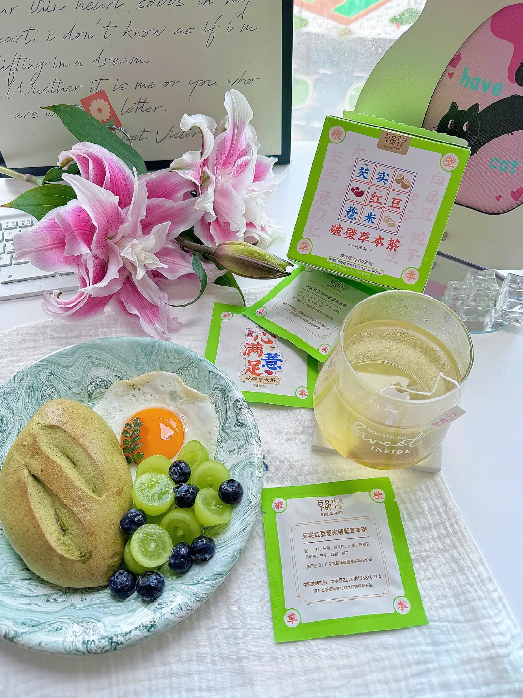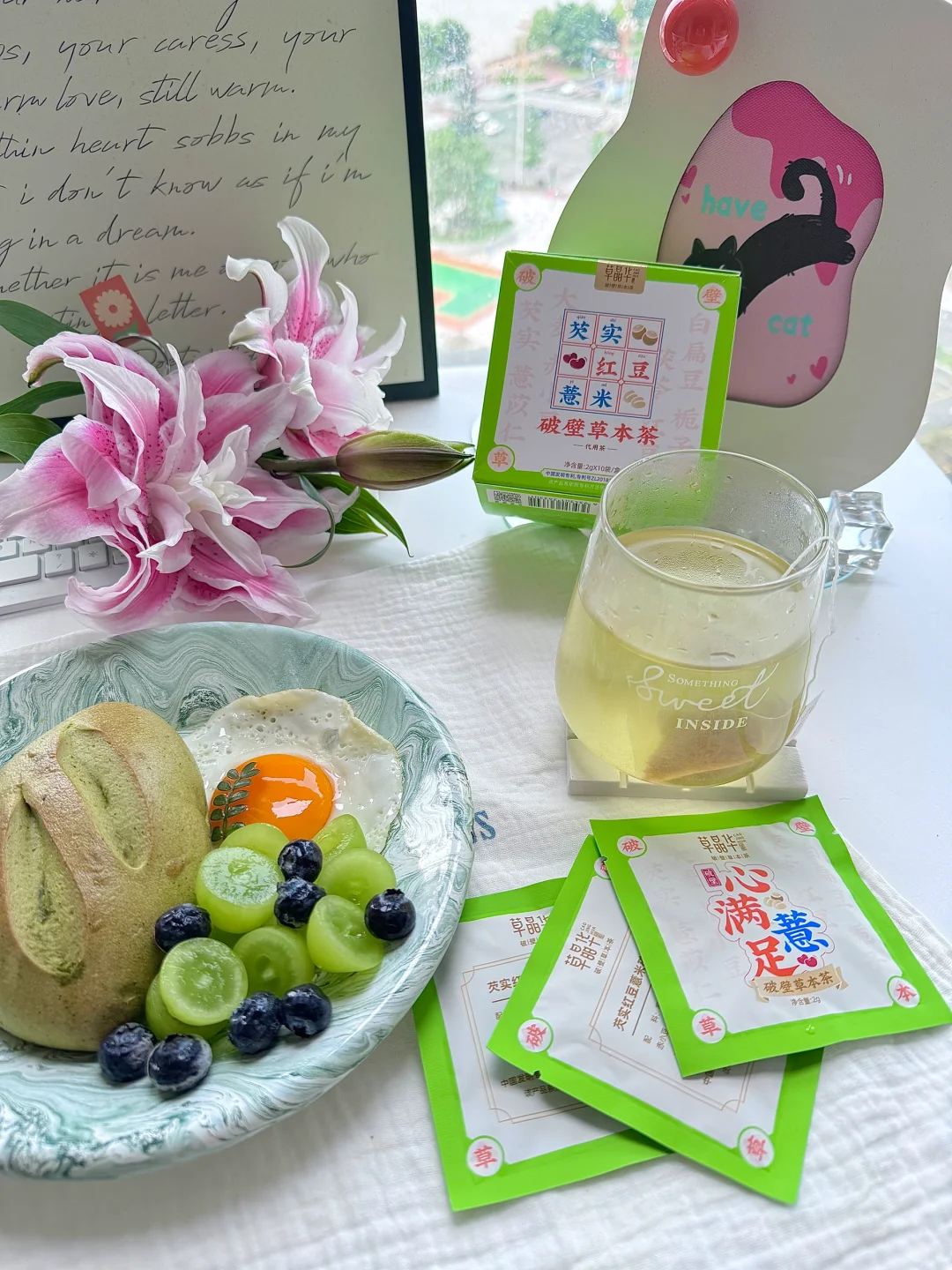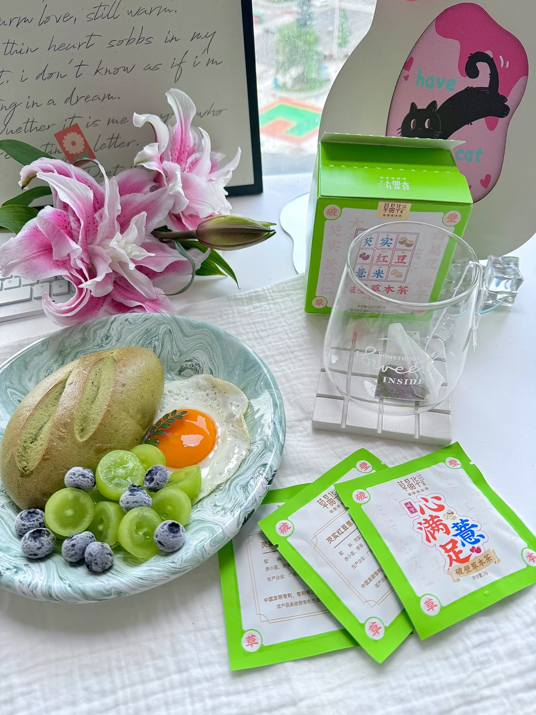 茉莉椰香碧螺春乳酪米面包|阳光玫瑰|蓝莓|鸡蛋|草本茶🍵 炎炎夏天,一杯透心凉的冰镇饮料几乎是很多人的「快乐源泉」!但其实在三伏天里,大量的冷饮会加重我们体内的shi气。来一杯热茶配上喜欢的米面包开启美好的一天 这款草晶华心满薏足破壁草本茶 很干净的配料,只有芡实茯苓红豆薏米 每一袋都是独立三角包装 冷热水均能泡,5秒get一杯香醇糯口的草本花茶