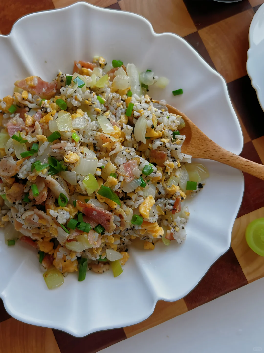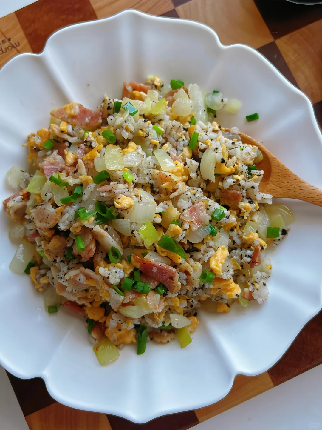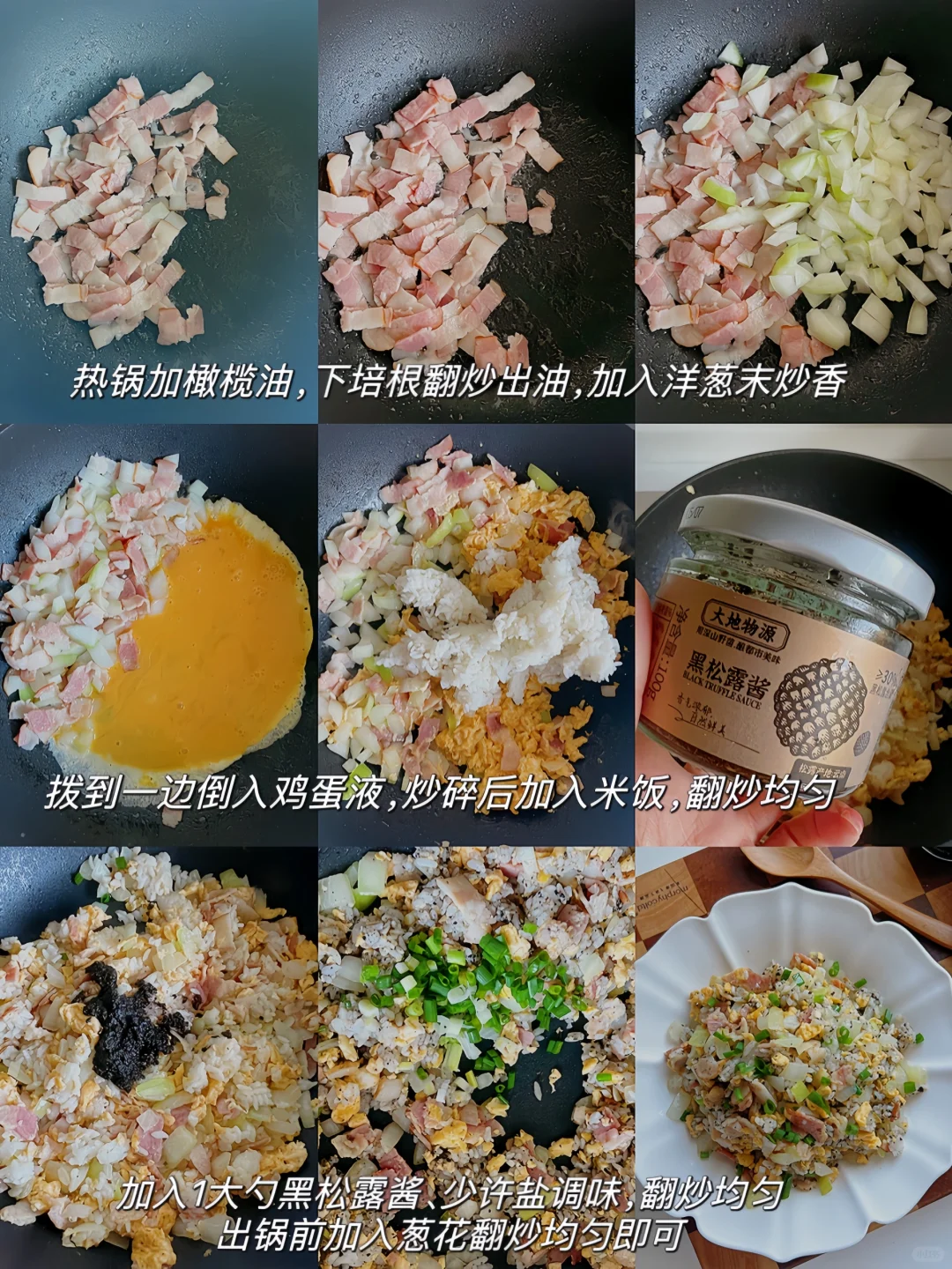 最近对黑松露炒饭真的很上头 今天把牛肉换成了培根,加了一点点盐和一大勺黑松露酱足矣 尝一口,妈呀!这味道简直了👍👍 食材: 鸡蛋2个 培根3片 白洋葱1/2个 黑松露酱1大勺 葱花、盐、橄榄油少许 方法: 1️⃣两个鸡蛋打匀,白洋葱切末,小葱切末,培根切段 2️⃣热锅加橄榄油,下培根翻炒出油,加入洋葱末炒香 3️⃣拨到一边倒入鸡蛋液,炒碎后加入米饭,翻炒均匀,加入1大勺黑松露酱、少许盐调味,翻炒均匀,出锅前加入葱花翻炒均匀即可 5分钟就可以搞定的黑松露培根炒饭, 尊嘟尊嘟,hin推荐啊!