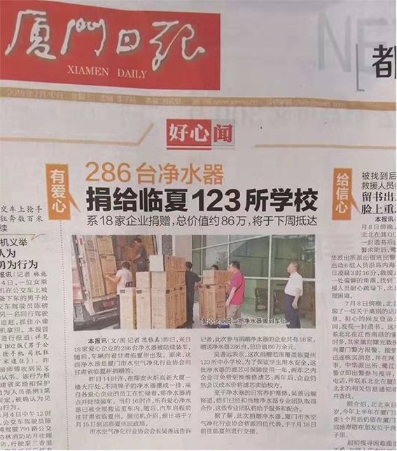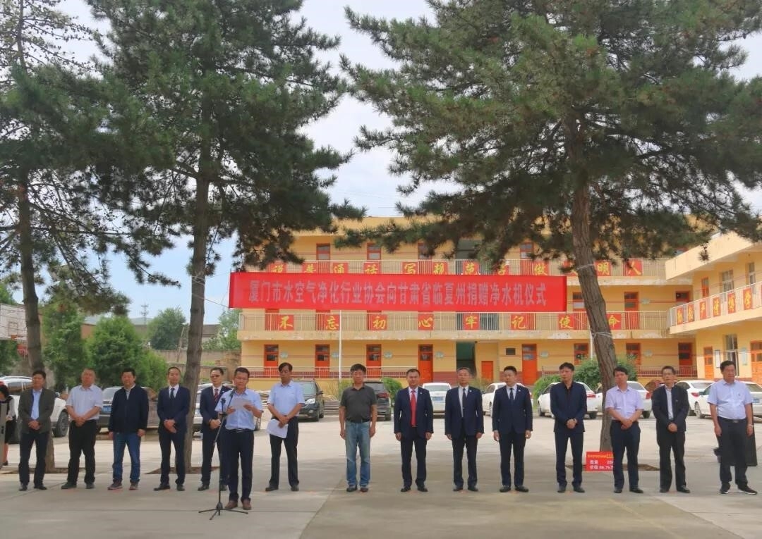2019年7月16日,厦门市水空气净化行业协会向临夏州捐赠净水器仪式在甘肃省临夏州东乡县东塬学校举行。临夏州政府、州民政局、积石山县政府、东乡县政府,厦门市民政局及厦门市水空气净化行业协会成员集体出席捐赠仪式;东乡县部分学校教师和学生代表参加仪式,临夏州民政局局长周子良主持仪式。仪式上,厦门市水空气净化行业协会向东乡县和积石山县的部分学校捐赠了净水器。临夏州民政局(州慈善协会)、东乡县政府、积石山县政府分别向厦门市水空气净化行业协会及参与捐赠的18家会员企业赠送了锦旗。