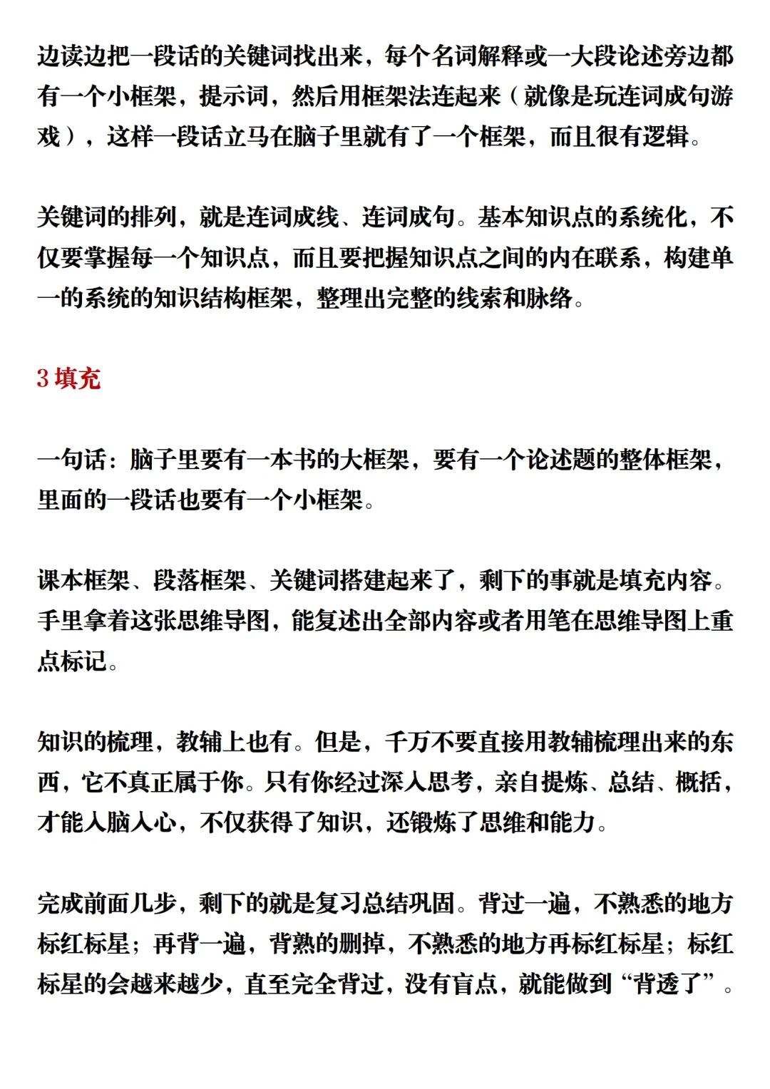 完成前面几步,剩下的就是复习总结巩固。背过一遍,不熟悉的地方标红标星;再背一遍,背熟的删掉,不熟悉的地方再标红标星;标红标星的会越来越少,直至完全背过,没有盲点,就能做到“背透了”。