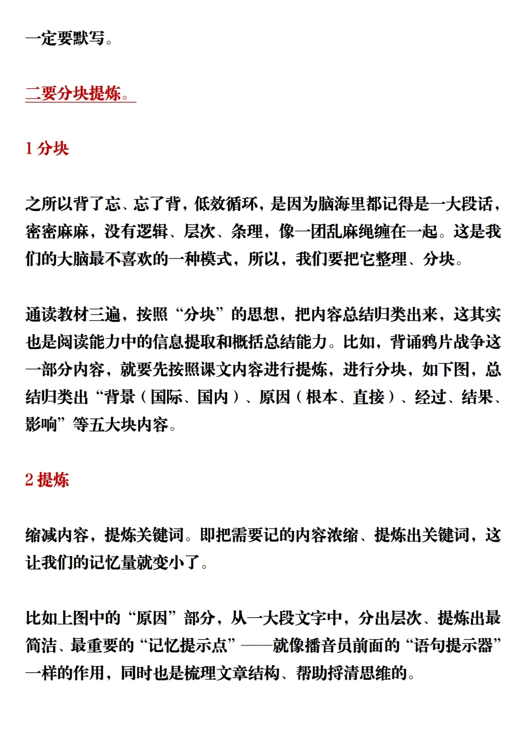 比如上图中的“原因”部分,从一大段文字中,分出层次、提炼出最简洁、最重要的“记忆提示点”——就像播音员前面的“语句提示器”一样的作用,同时也是梳理文章结构、帮助捋清思维的。
