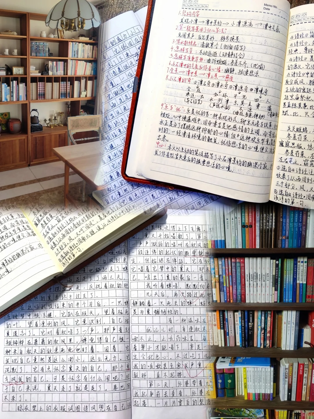 语文课堂笔记本,除了老师的讲解记笔记(用黑色笔),自己看同步教辅,进一步巩固、拓展,在笔记本上补充记录(用红笔)。这样在复习的时候,能一目了然的看到课堂内容和自己拓展的内容。