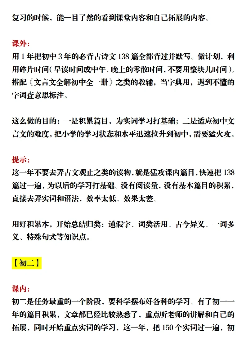 用1年把初中3年的必背古诗文138篇全部背过并默写。做计划,利用碎片时间(早读时间或中午、晚上的零散时间,不要用整块儿时间)。搭配《文言文全解初中全一册》之类的教辅,当字典用,遇到不懂的字词查意思标注。