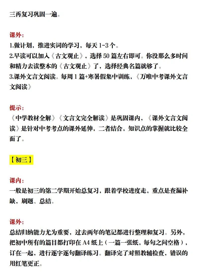 总结归纳能力尤为重要,过去两年的笔记都进行整理和复习。另外,把初中所有的篇目都打印在A4纸上(一篇一张纸,每句之间空格),订在一起,进行逐字逐句翻译练习。翻译完了对照教辅检查,错误的用红笔更正。