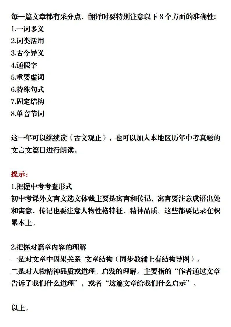 这一年可以继续读《古文观止》,也可以加入本地区历年中考真题的文言文篇目进行朗读。