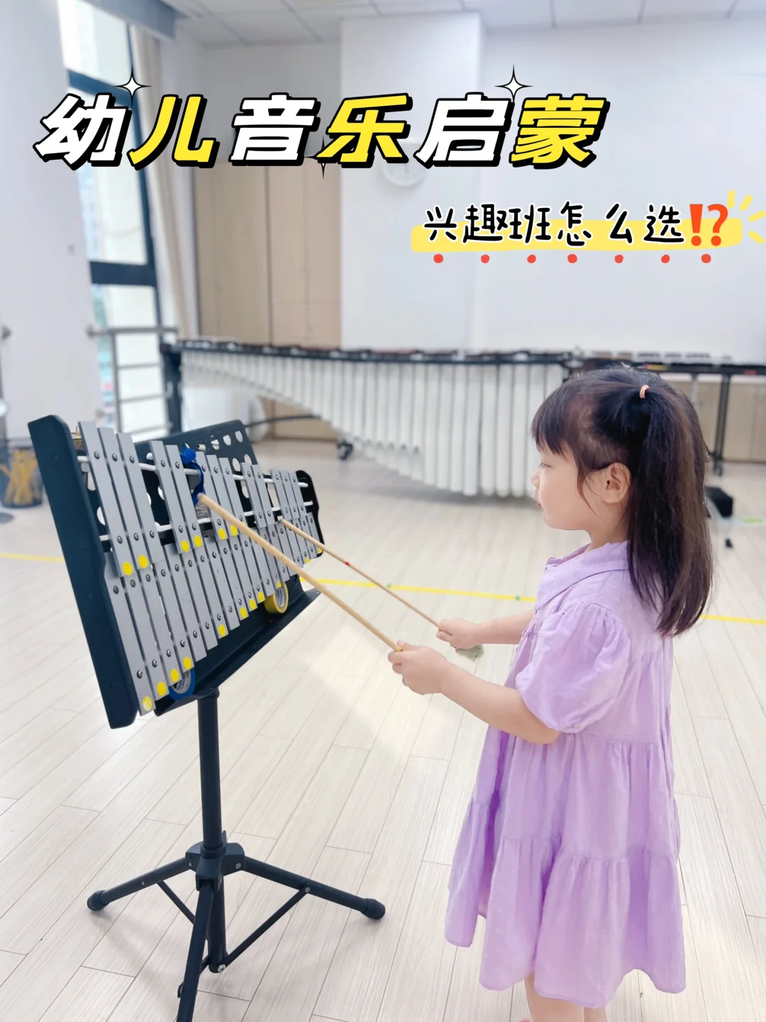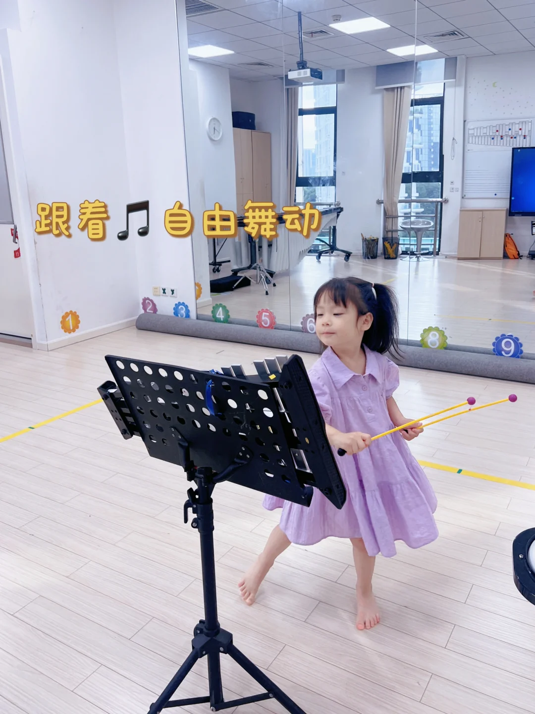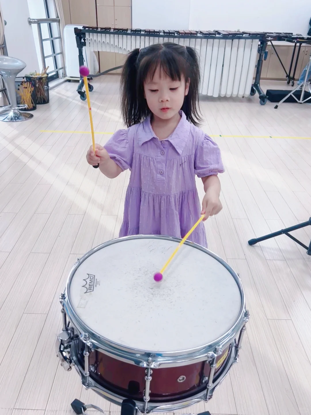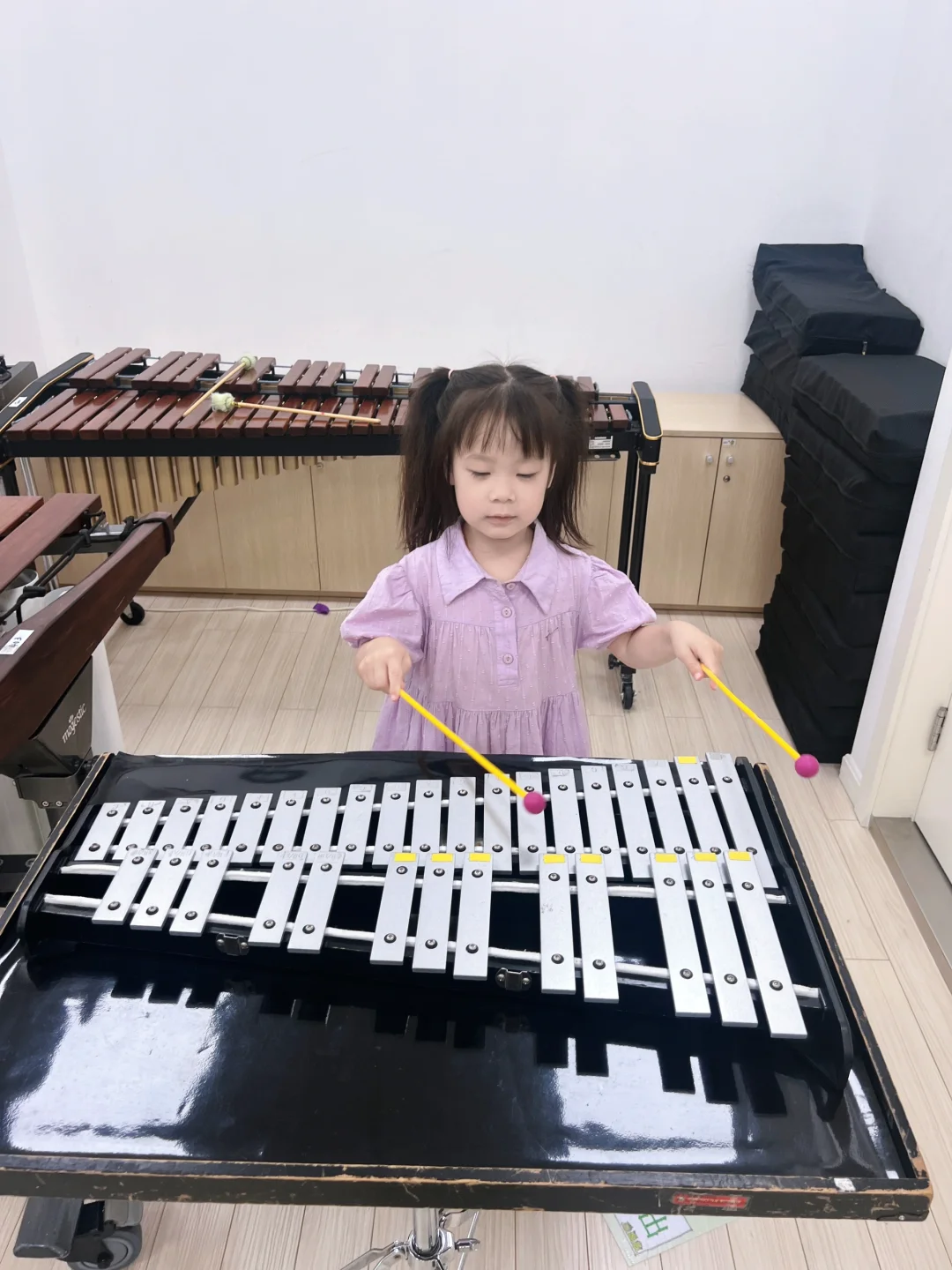 🟢妮妮兴趣💯分,下课后都不肯走,将教室里每种乐器都敲打了一番