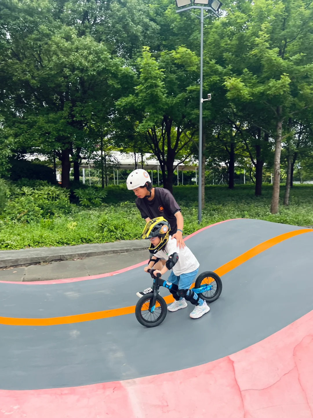 🔸教练一对一陪同,起初刚接触泵道妮妮有些害怕,教练一直扶着陪跑,适应以后骑车跟随保护、指导