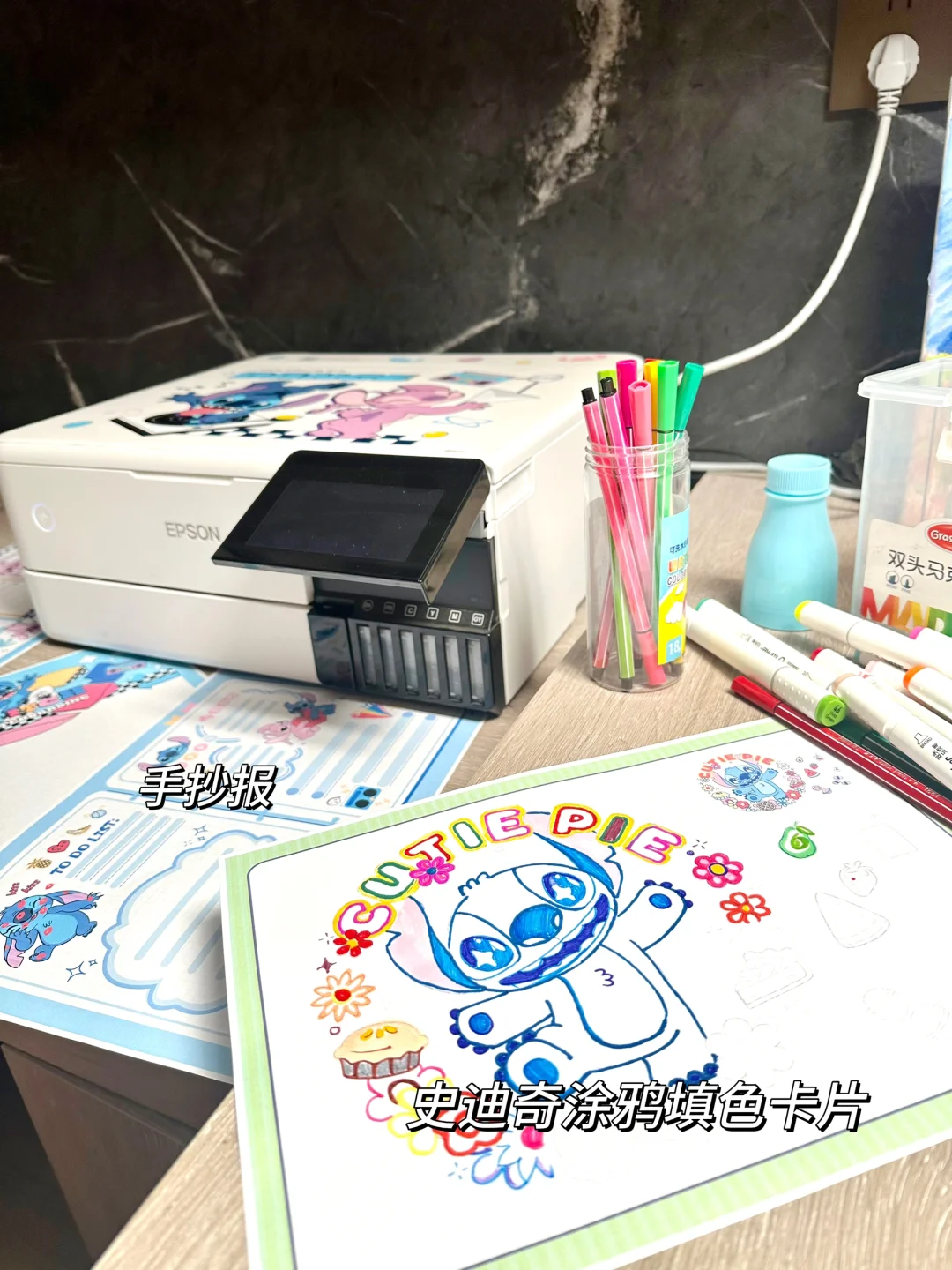 🌈开学即中班的妮妮,陆陆续续增加了一些描红作业,加上平时经常外出拍照,抱着早买早享受的心态,入了打印机 🔹首先颜值就得到了妮妮的认可,史迪奇‼️‼️ 🔹平时除了一些资料、学习文件,小🍊序上还有迪士尼其他系列IP如草莓熊、冰雪奇缘、玩具总动员等 🔹还有贴纸,奖励贴,涂色卡,手帐等素材都可以用来DIY小卡片,手帐安排✅ 🔹6色墨仓打印贴纸跟照片的色彩颜色geng还原,印出的卡通贴纸妮妮都爱不释手 🔹空间占用也不多,平时就放在书桌上,一点都不占地~