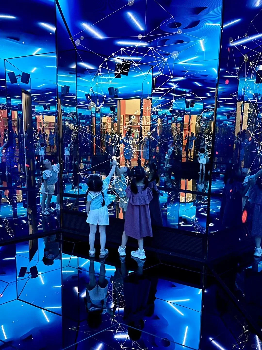 ✔️《十万个为什么》奇妙屋,六边形镜面加灯光营造出酷炫光影空间。玻璃镜面上有好几个年份按钮,每个按钮都会变化不同的光效,超级绚烂