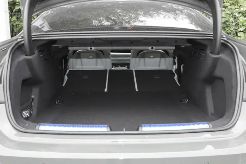 车身侧面的溜背线条从 B 柱平缓延伸至车尾,既保证了头部空间,又勾勒出流畅的轿跑姿态。19 英寸五辐轮毂搭配红色刹车卡钳,进一步强化运动属性,而隐藏式电动门把手在解锁时自动弹出,既降低风阻,又提升了豪华感。车尾的贯穿式 LED 尾灯在夜间点亮时呈现动态流水效果,掀背尾门的设计不仅让造型更饱满,更兼顾了实用性,轻轻按压 logo 即可开启,开启角度可通过车机自定义调节。