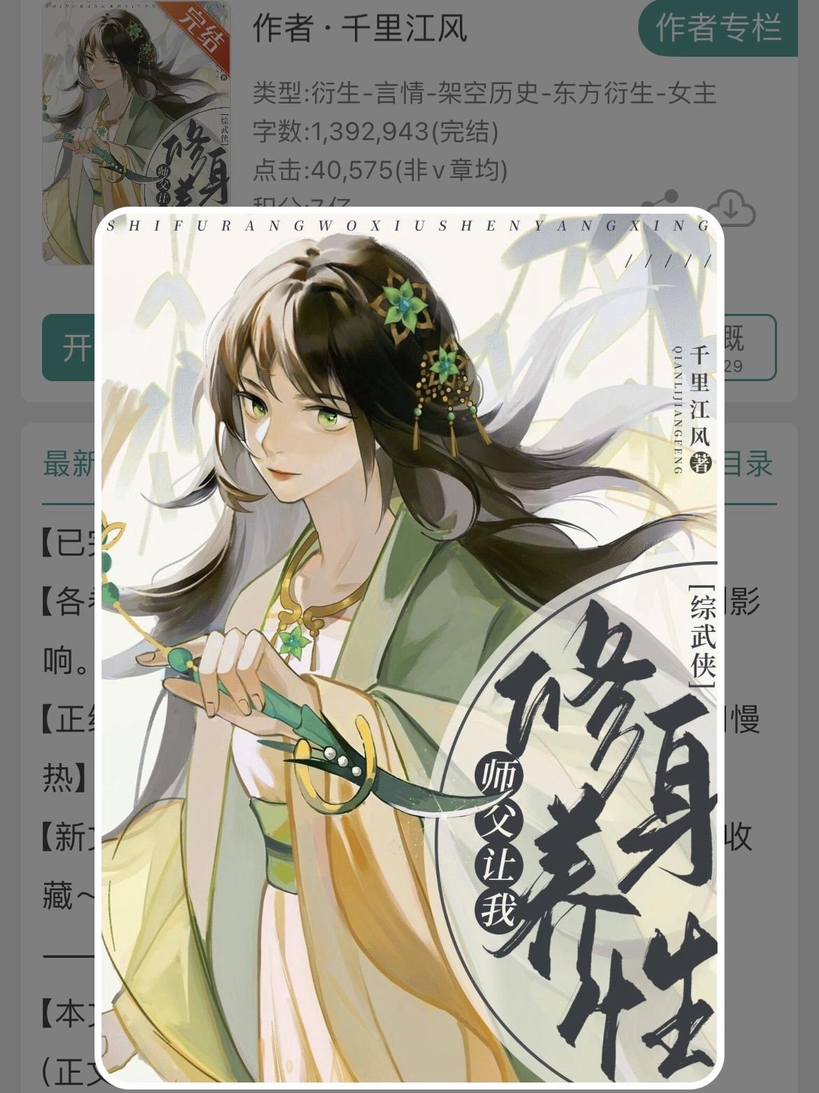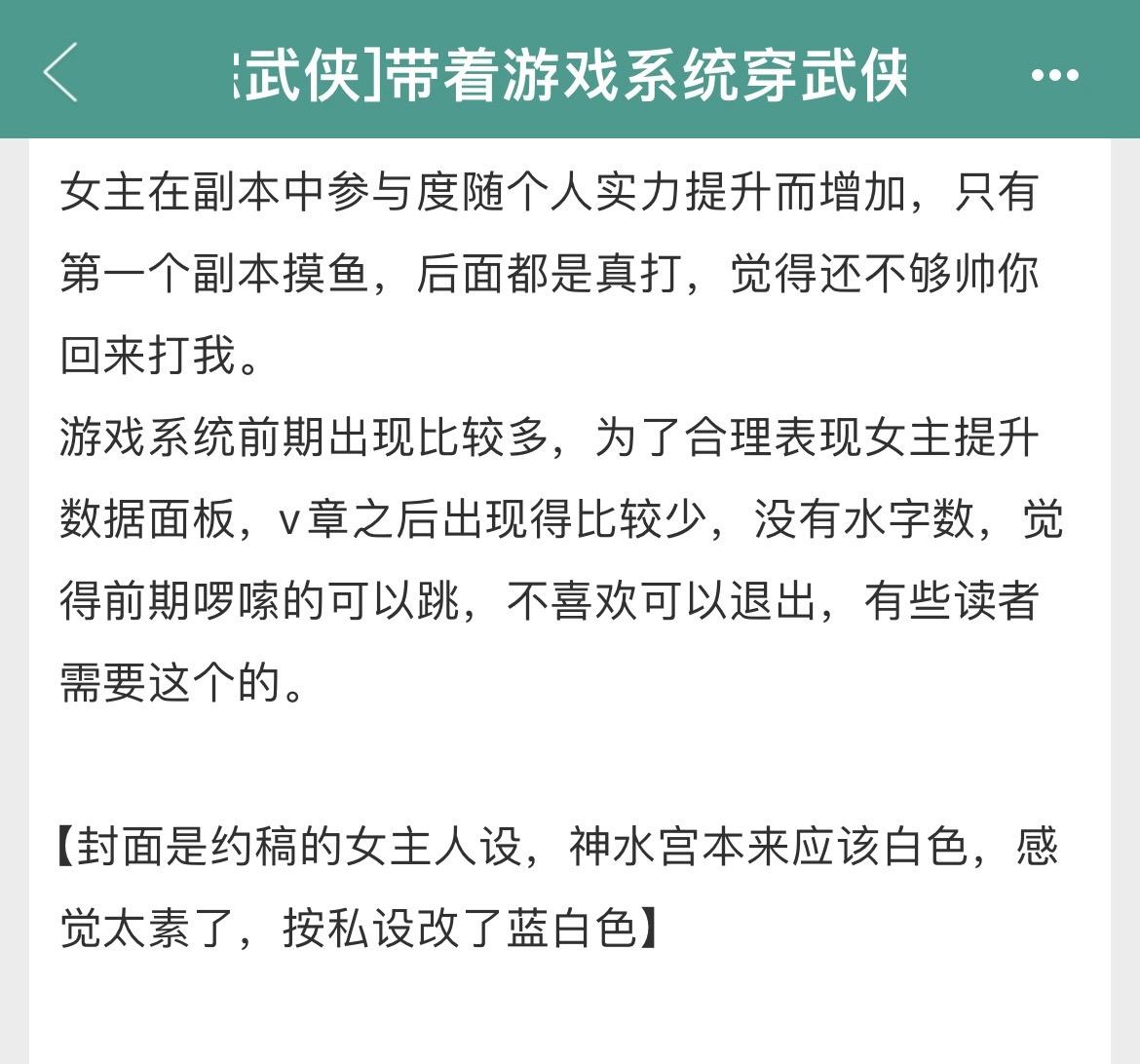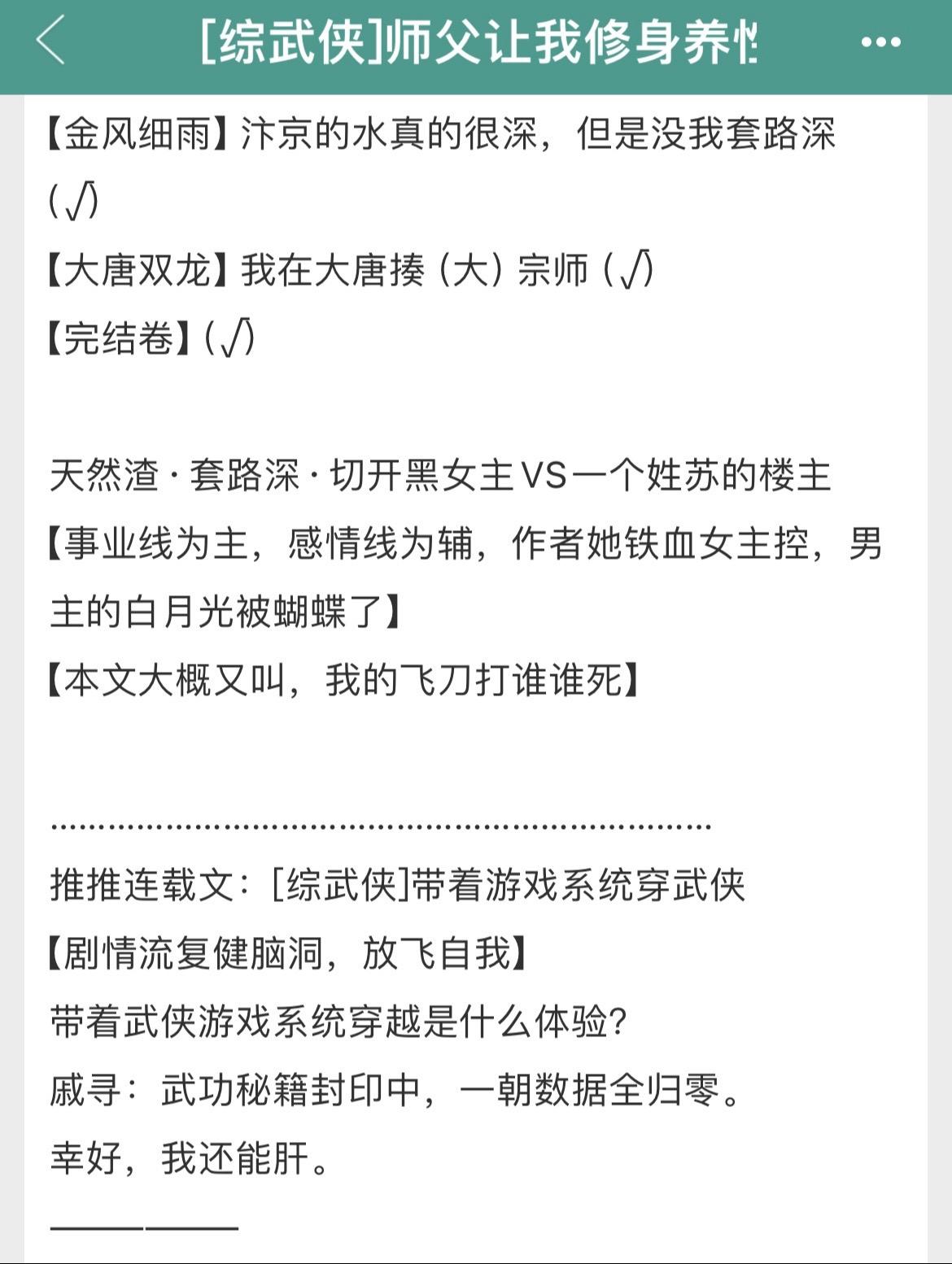 两本综武侠大女主爽文!全程无虐!两本综武侠大女主爽文!全程无虐! 书名: ①《[综武侠]带着游戏系统穿武侠》 ②《[综武侠]师父让我修身养性》 作者:千里江风 标签:综武侠、女强、系统、爽文、轻松