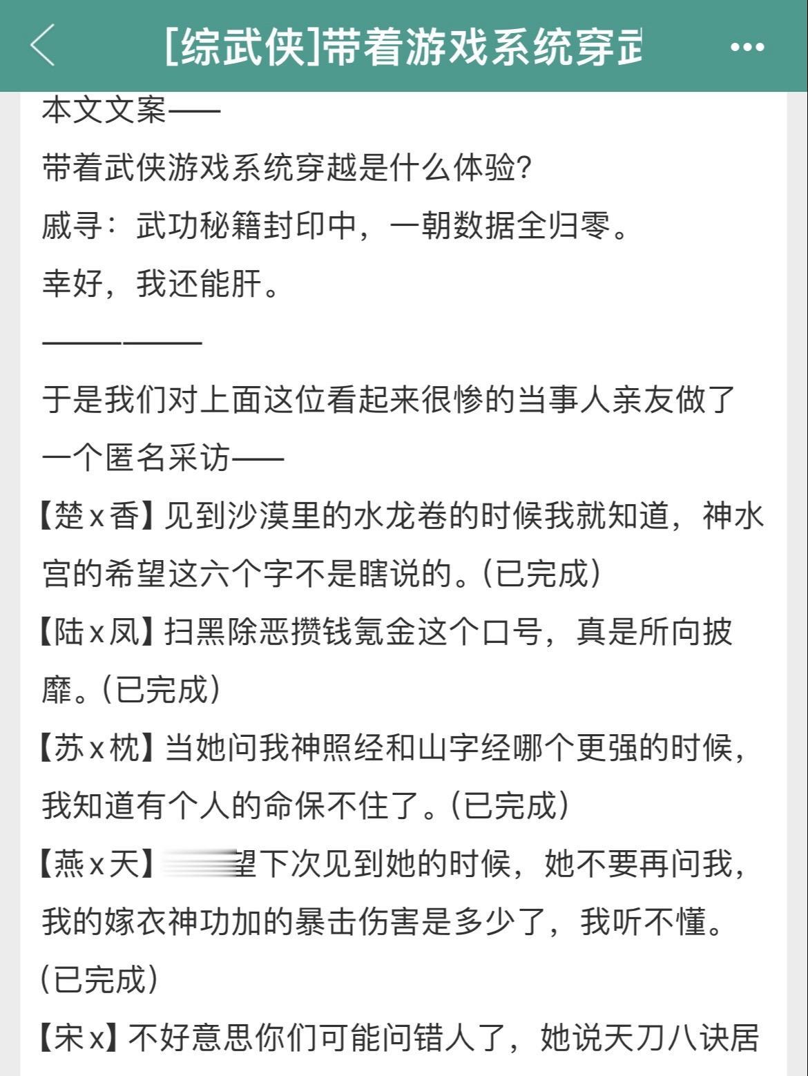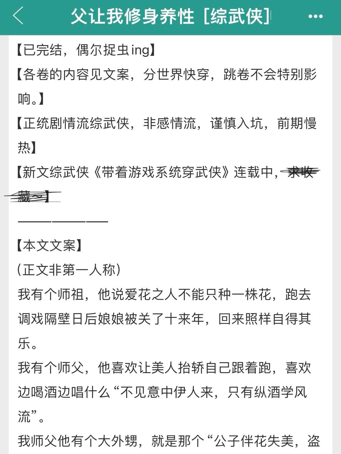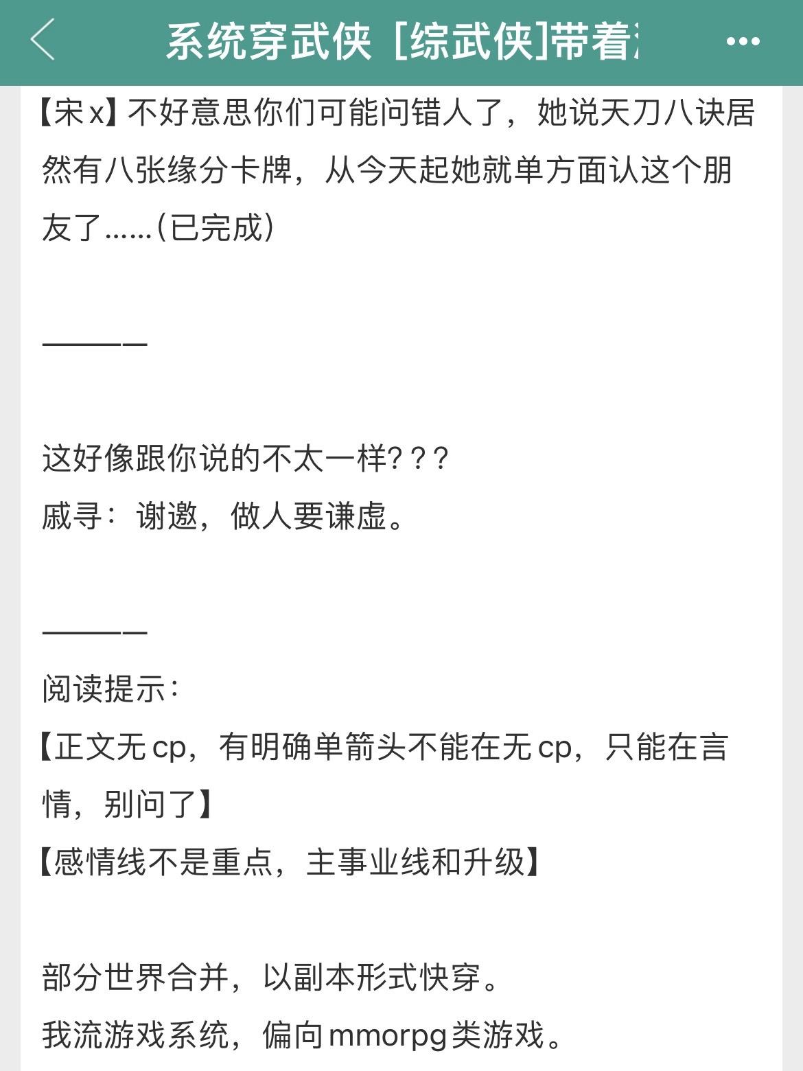 两本综武侠大女主爽文!全程无虐!两本综武侠大女主爽文!全程无虐! 书名: ①《[综武侠]带着游戏系统穿武侠》 ②《[综武侠]师父让我修身养性》 作者:千里江风 标签:综武侠、女强、系统、爽文、轻松