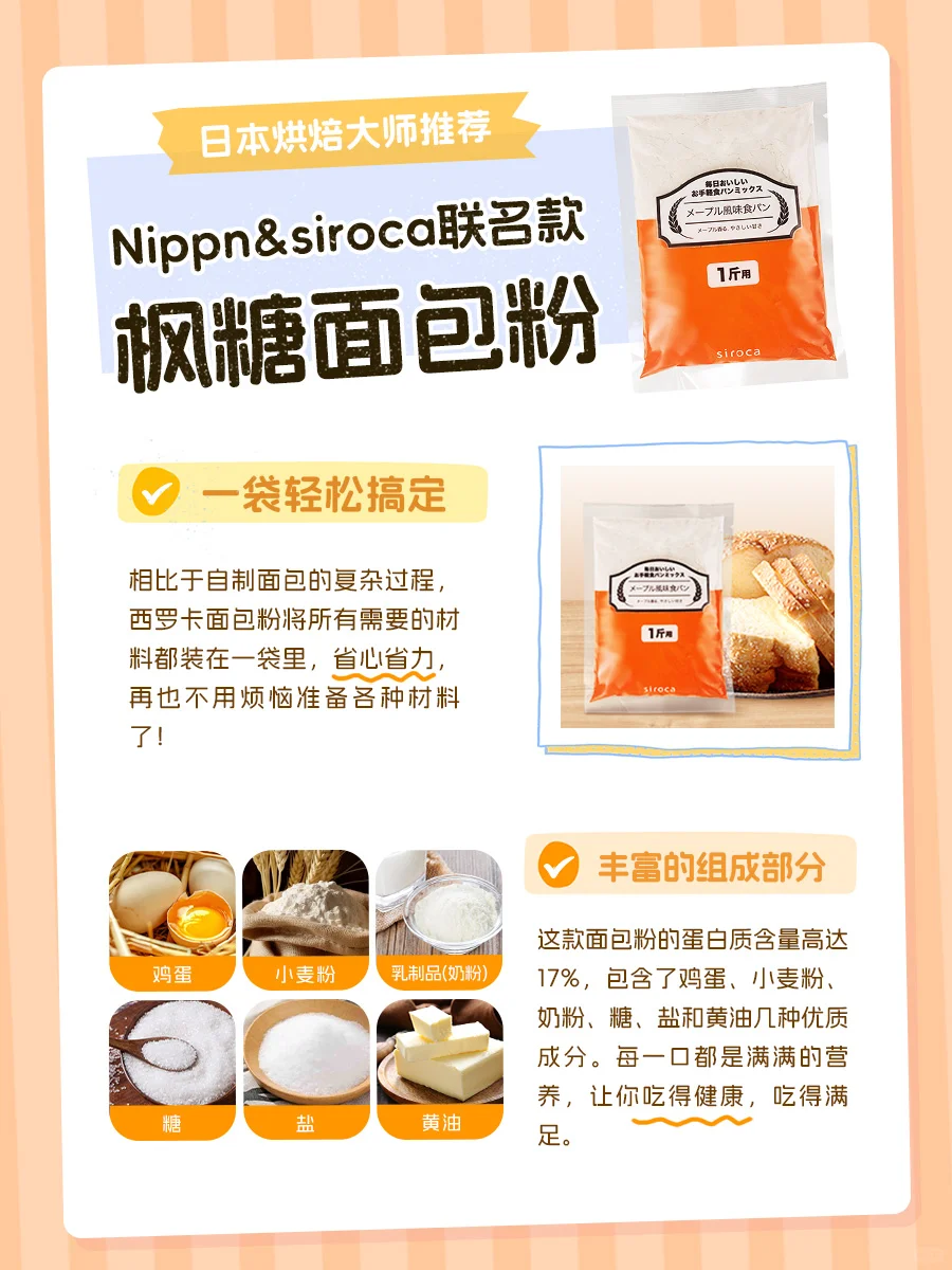 Hey爱烘焙的宝子们![飞吻R] 是不是每次看到朋友圈里那些诱人的自制面包就手痒心痒,但一想到复杂的步骤和材料配比就望而却步? 别怕,今天就给大家安利一款日本原装进口,专为面包机定制的——Nippn与Siroca联名推出的枫糖面包粉[偷笑R] 一袋就是一面包,让你轻松享受烘焙的乐趣,健康美味两不误![派对R]