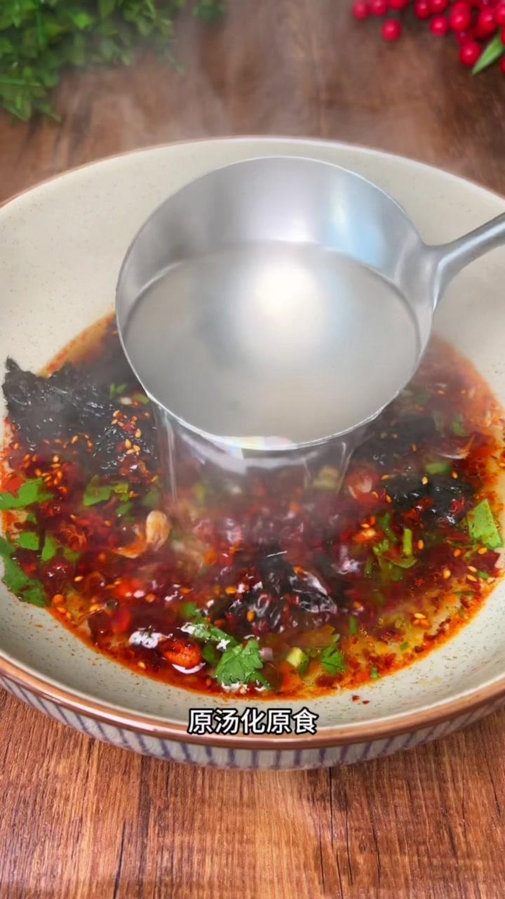 1️⃣碗中放葱花香菜、虾皮紫菜、盐鸡精、生抽陈醋、芝麻香油,能吃辣的加辣椒油。