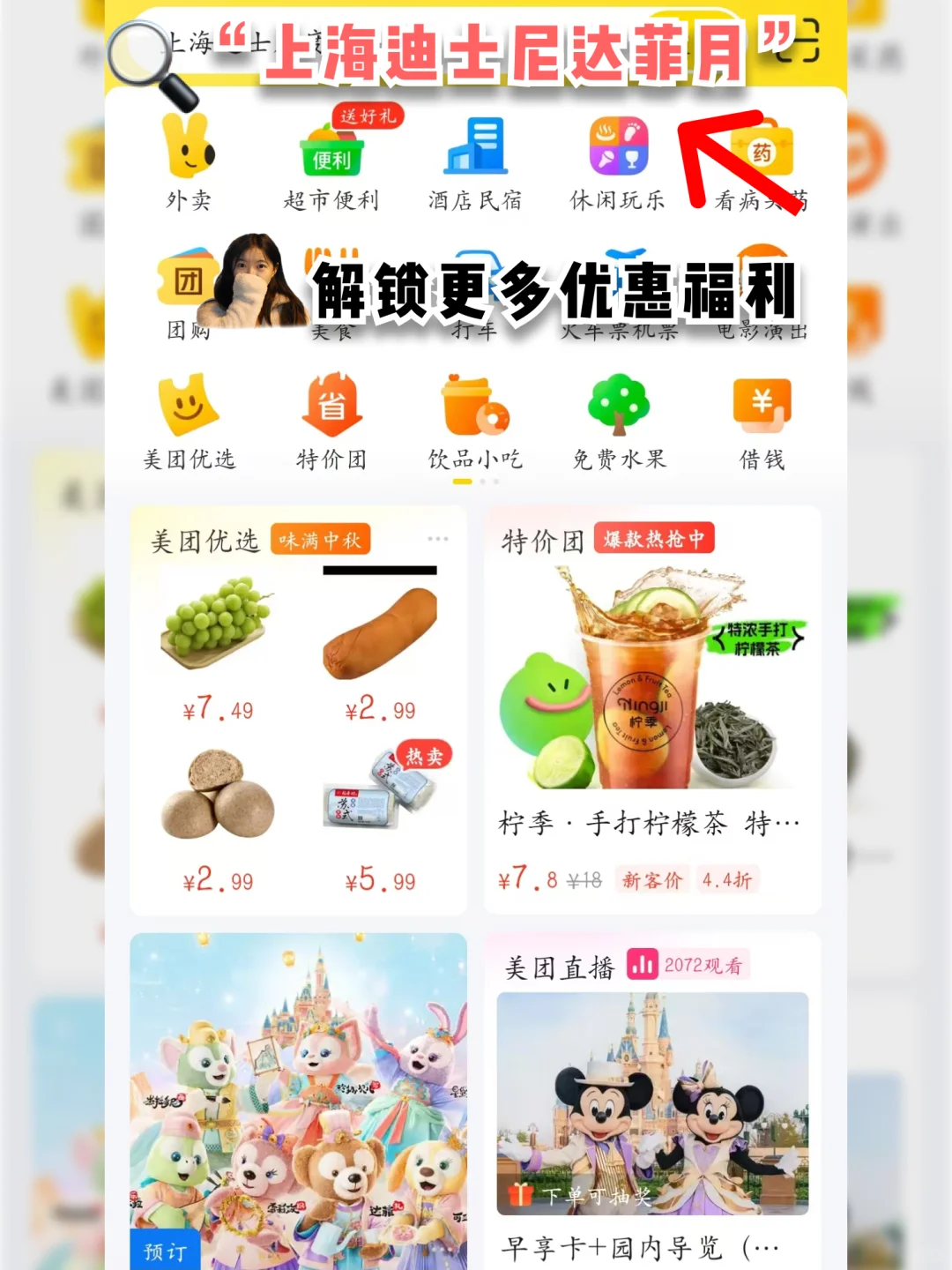 打工人终于要迎来中秋国庆假期,真的太需要一场来自上海迪士尼的治愈❤️‍🩹! 现在正是达菲月,萌友们都穿着仙仙的中式服饰和大家互动,迫不及待要出发了! 话不多说,攻略奉上📒 门票: 上美团,搜索🔍“上海迪士尼达菲月”就能看到超多活动。特惠早鸟票立省一杯☕️、三人票更是83折起,很适合跟朋友们一起去~ 9月21日,在首页点击美团官方直播间,就能进入上海迪士尼专场直播,可以抢免费门票、大额红包,还有超多可爱的正品周边,春日、牛仔风的玲娜贝儿真的太萌了~ - 可提前下载迪士尼度假区APP,实时关注排队情况。🤔你知道上海迪士尼有多少项目可以玩吗?有40多个! - 【疯狂动物城】 🔥热力追踪:还原电影场景,让你沉浸式体验疯狂动物城追捕计划。 - 【梦幻世界】 🔸小熊维尼 🔥小矮人矿车 🔸旋转蜂蜜罐 🔸晶彩奇航 🔸爱丽丝迷宫:全球迪士尼乐园中第一个以真人电影《爱丽丝梦游仙境》为主题的地方 🔸漫游童话世界 🔸小飞侠天空奇遇 - 【宝藏湾】 🔹探索家独木舟 🔥加勒比海盗 🔹海妖复仇号 🔹传奇戏海滩 - 【玩具总动员】 🔥抱抱龙冲天赛车:最刺激的项目,谨慎; 🔸胡迪牛仔嘉年华:坐在驴车上尽情甩驴; 🔸弹簧狗团团转 - 【奇想花园】 🔹小飞象 🔹旋转木马 - 【探险岛】 🔥飞跃地平线:必打卡项目,带你轻松环游世界,亲子友好; 🔥雷鸣山漂流:水上项目,需雨衣 🔸古迹探索营 - 【明日世界】 🔥创极速光轮:摩托式过山车。科技感风满满,不过九月维护中 🔥巴斯光年星际营救 🔹喷气背包飞行器 🔹太空幸会史迪奇 - 【漫威英雄总部】 🔸变身钢铁侠 - 线路推荐 🌈【热门项目路线】 热力追踪→飞越地平线→创极速光轮→漫游童话时光→花车巡游→加勒比海盗→米奇大街→城堡夜光幻影秀 🌈【亲子游路线】 漫游童话时光→小熊维尼历险记→爱丽丝梦游仙境迷宫→七个小矮人矿山车→花车巡游→小飞侠天空奇遇记→晶彩奇航→冰雪奇缘→小飞象→幻想曲旋转木马→米奇大街→城堡夜光幻影秀 - 达菲和朋友们的赏月佳会: 演出时间 13:10 15:05 16:30