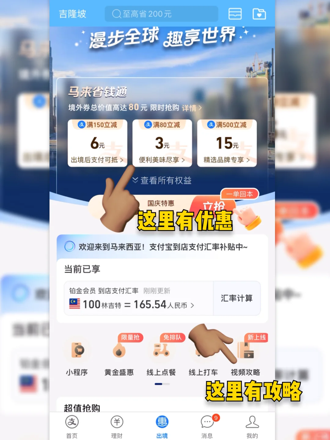 人均4k玩完了9天,给姐妹们说点真实感受&评论区的常见问题解答: 🗺️我的行程路线: 吉隆坡→马六甲→新加坡→新山→亚庇 - ❌我踩过的坑: 1.国外酒店式民宿一般都是发你pdf让你自助办理入住,但国内app有可能不会给你转发,需要提前问好国内的APP客服,不然有可能会在大门口等很久。 2.新加坡打车是真的很贵,推荐坐地铁,而且市中心景点都挨的很近,可以步行。 3.马来西亚打车便宜,人多可以打车,方便快速不用等。 4.非常loacl的马来人路边摊只接受现金马币,记得备点现金。 - 🥰个人感受: 1.现金不用准备太多,新马很多都支持支付宝,我呆了九天,用到现金的次数手指都数的过来。而且atm机可以随时取现。 2.保持一份警惕心,也挺安全。 3.可以提前规划一下路线,这样可以在有限的时间看到更多风景。 4.新马酒店都是禁止携带榴莲和山竹的。 5.马西亚物价不贵,有三分之一的华人,对第一次出国的人很友好。 - 🐴出行准备: 1.必备物品:护照(离过期至少6个月以上),新马电子入境卡(0~3天内填写),电话卡/流量卡(可以提前网上购买,也可以开通境外流量),转换插头(英标三孔转换头) 2. 出发前在支付宝搜索🔍“惠出境”,可以看到攻略以及领取各种优惠福利。到达目的地后更新定位吉隆坡,直接点击底部惠出境即可丝滑进入会场领券,像柏威年广场累积消费满4000元还能立返200元券。 - 💬评论区常见问题: 【行李怎么解决?】 除了第一天,吉隆坡机场→布城→市中心,在布城的时候我把行李寄存在景区,其他时间都在出租车上。 吉隆坡→马六甲→新加坡,去巴士车站,行李在车上,坐巴士,行李在巴士车上。到了目的地也是先到酒店放好行李在出来玩的。不是一路提着行李旅游。 【可不可以频繁往返新马?】 正常往返两三次是没问题的,本人亲测。 【可不可以马来西亚入境,新加坡回国?】 可以 【可不可以新加坡入境,马来西亚回国?】 可以 有任何问题欢迎在评论区提问哦~