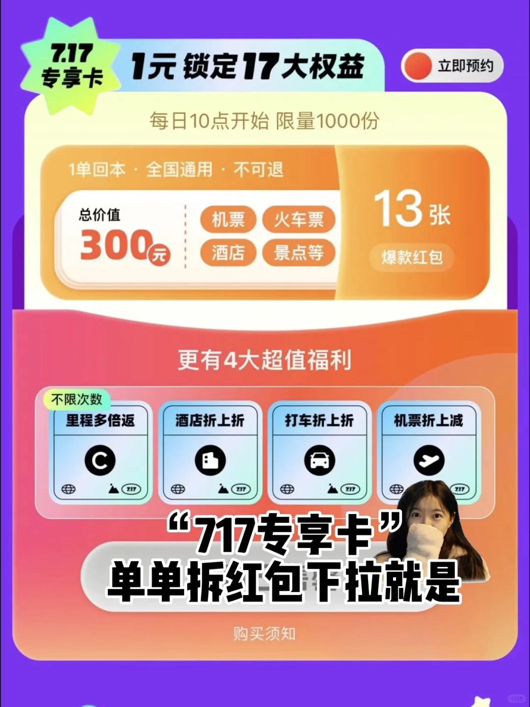 最近同程旅行有活动,🔍“同程717”,每天10点🕚准时开抢,1元就能解锁300r🧧➕[四R]项超值权益的“717专享卡”!机酒/门票[薯券R]等都有优惠!先到先得哦!