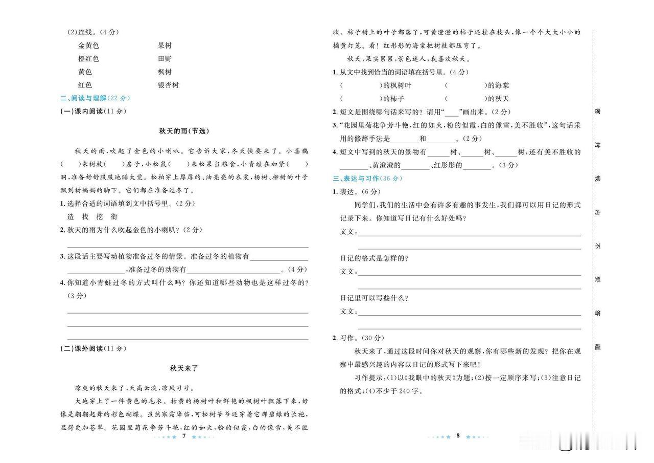 2024秋统编版语文三年级上册第二单元达标检测卷