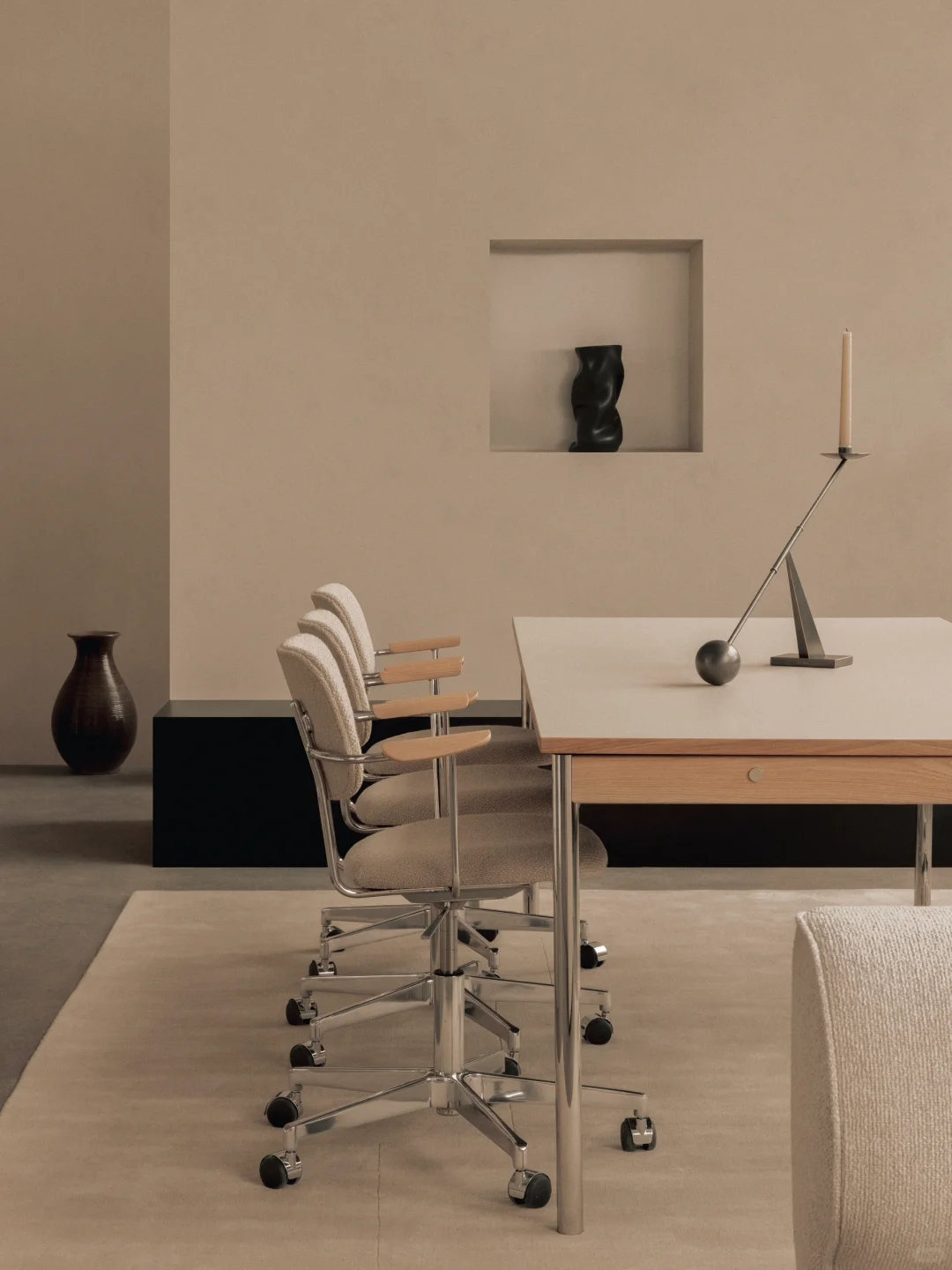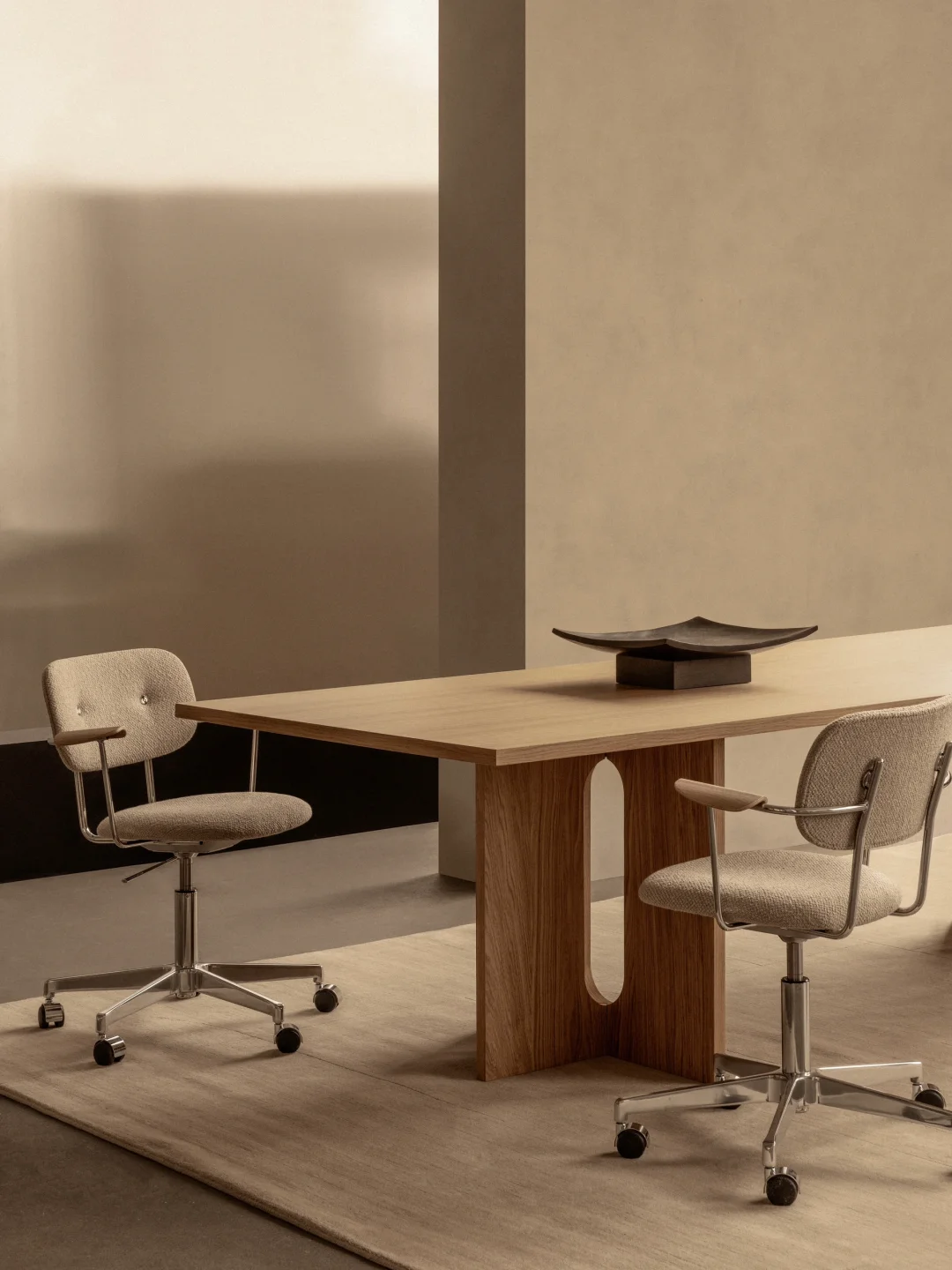 Co Chair系列是Norm Architects与Audo合作,为联合办公场所The Office Group所打造的,其设计核心源于“Co”这一前缀词的定义——共同的,相互的,旨在契合当下共享式的办公环境与生产方式。 Norm Architect在今年推出全新Co系列,在其深具底蕴的设计理念上更上一层,兼顾了现代美学和办公需求,将美观性、功能性和耐用性融为一体,从而适用于更加灵活多样的办公场景。其简单而优雅的外设计,延续了该系列的整体风格,让其无缝融入原有系列的典雅氛围。 —— Co Table Co Task Chair Co Dining Chair,Outdoor