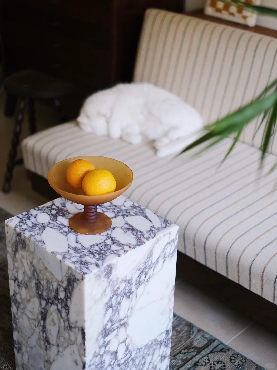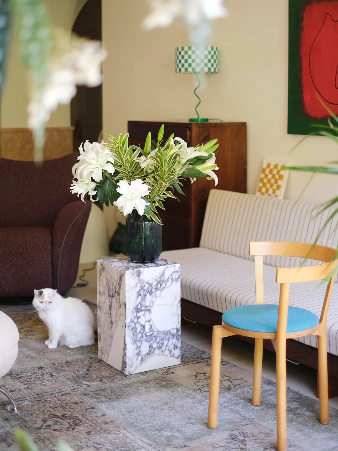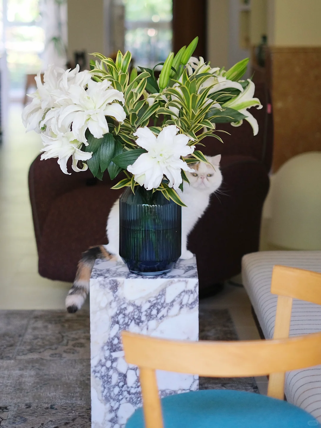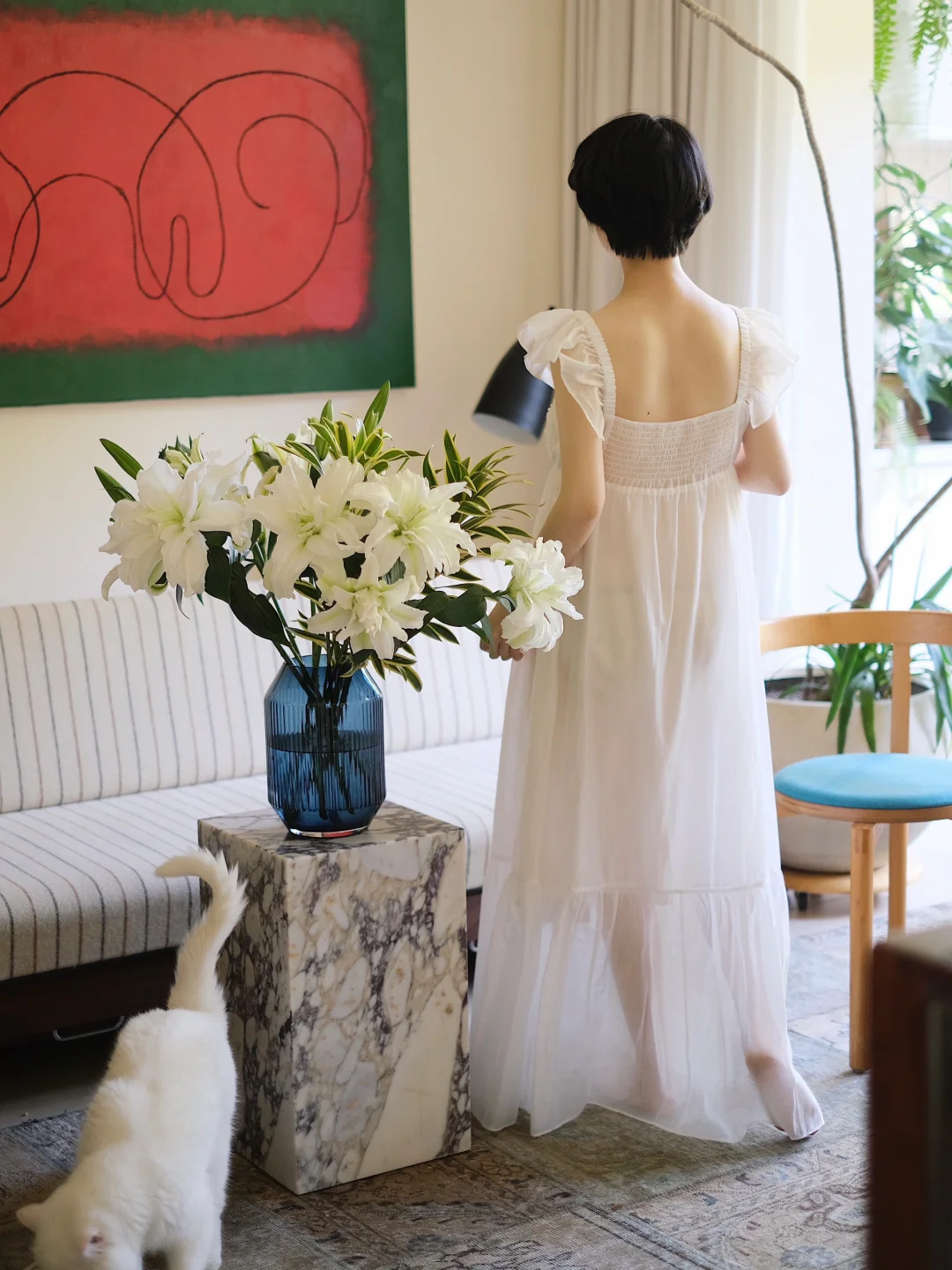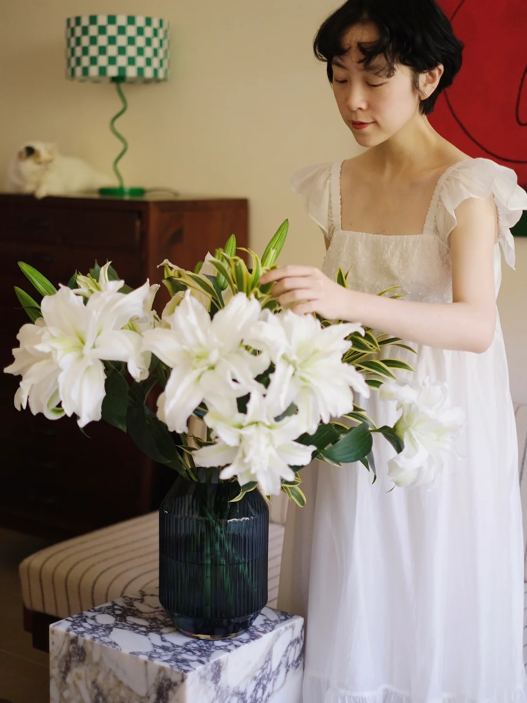 随着腹中新生命的临近,花艺师的心境也如夏日一般,饱含热切又躁动不安,起居之间,需要一些清凉沉静而令人安适的点缀。 于是,白绿色系的重瓣百合与Carrara大理石材质的Plinth Tall形成了完美搭配。在缕缕芬芳间,沉静淡雅的自然纹理仿佛能放慢时间,在嗅觉与视觉上,共同为夏日的室内增添凉意。 Plinth Tall以沉静的永续之美,于日常中见证新生。