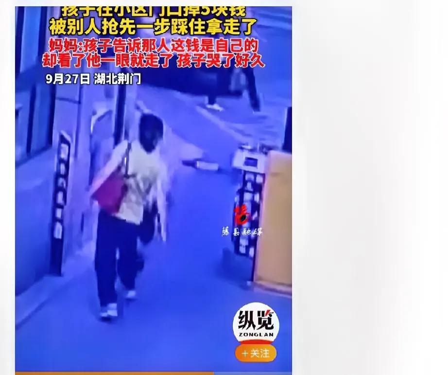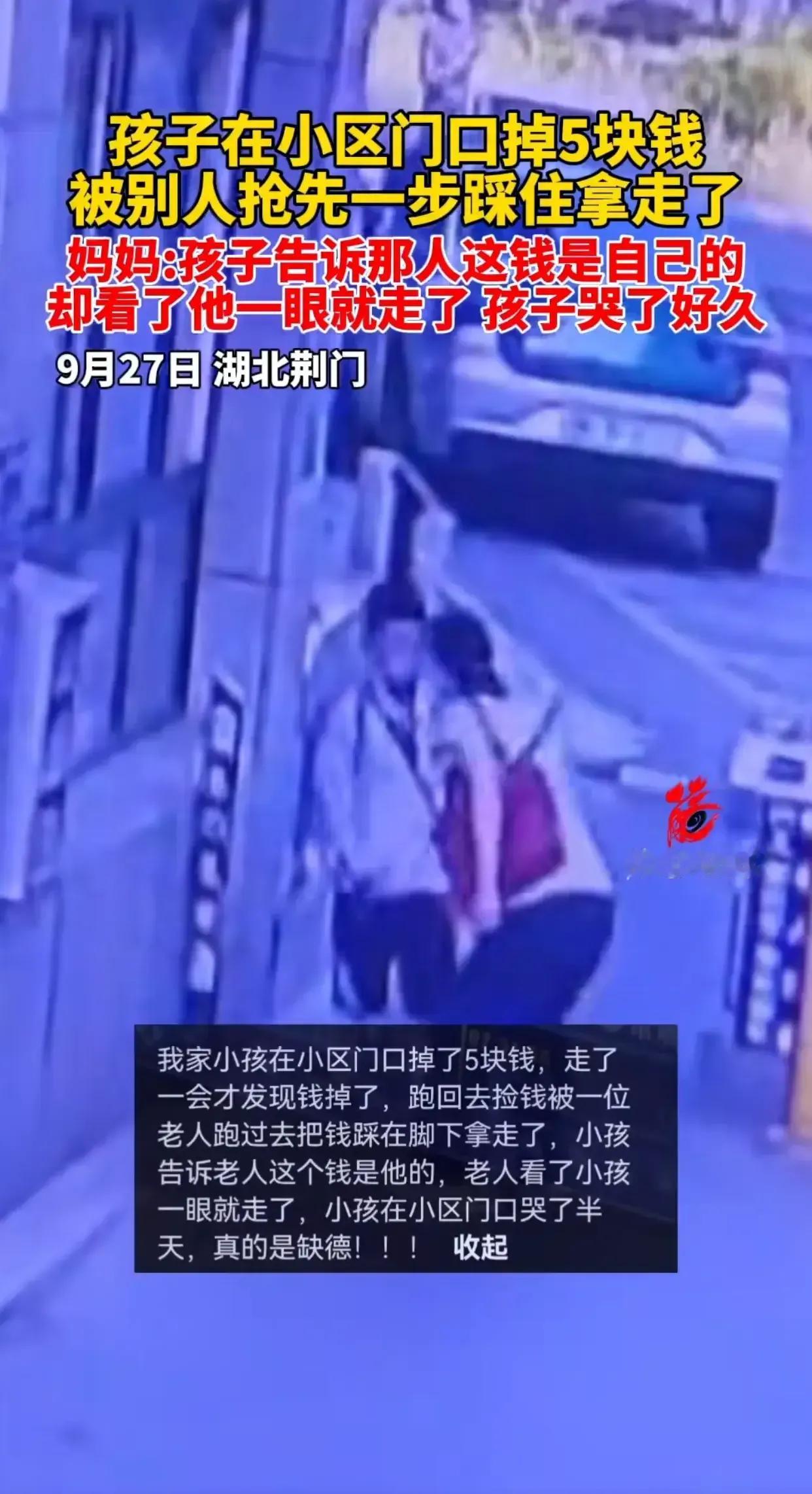 在湖北荆门的一个小区门口,发生了一件令人揪心的小事。一个孩子不小心掉了5元钱,这本是一件平常的事,可接下来的发展却让人难以接受。 当孩子发现钱掉了,正准备去捡的时候,一位老人却抢先一步。只见老人一边踩住钱,一边将钱拿走,仿佛这钱本就属于他。孩子急忙告知老人钱是自己的,然而老人只是看了孩子一眼,便径直走开。那5元钱,对孩子来说可能是可以买心仪小零食或者小玩具的一笔“巨款”。孩子望着老人离去的背影,在小区门口伤心地哭了半天。 这一幕被孩子妈妈记录下来,这短短几分钟的画面,不仅是5元钱的归属问题,更反映出人性的某些方面。在这个小小的事件里,孩子的纯真和无助,老人的行为,都像一颗石子投入湖中,泛起层层涟漪,值得我们深思。#这样的故事火了# #今日 深思分享# #今日深思分享#