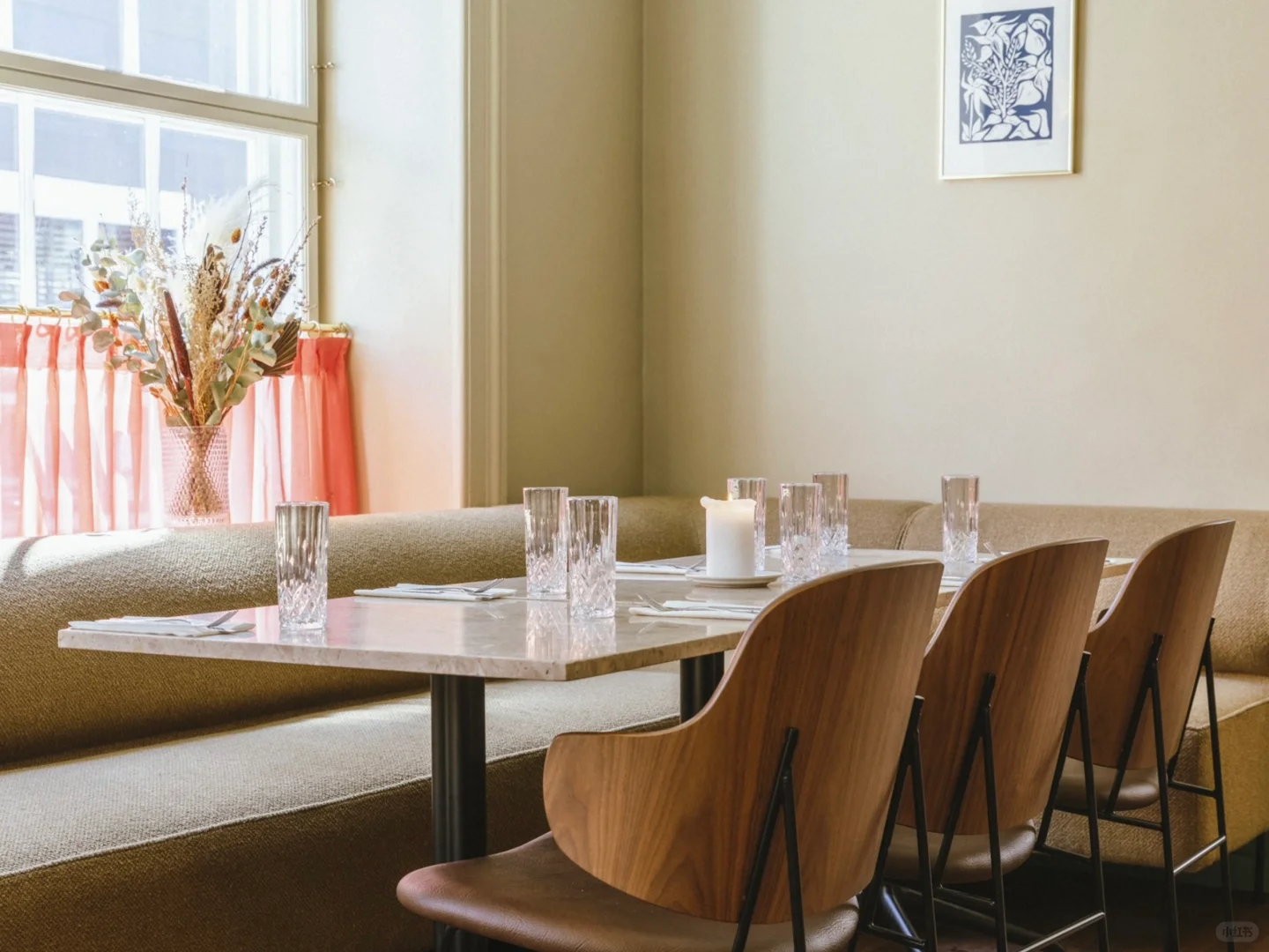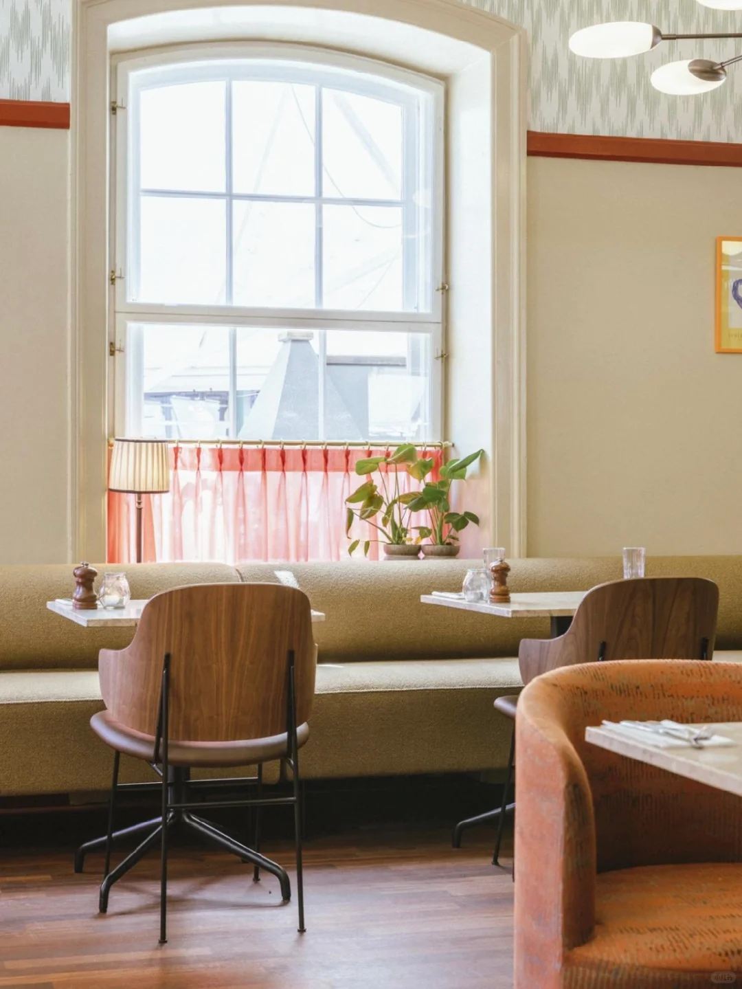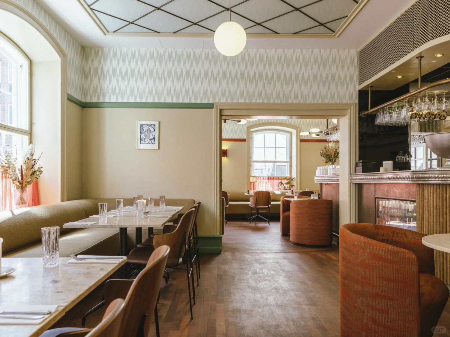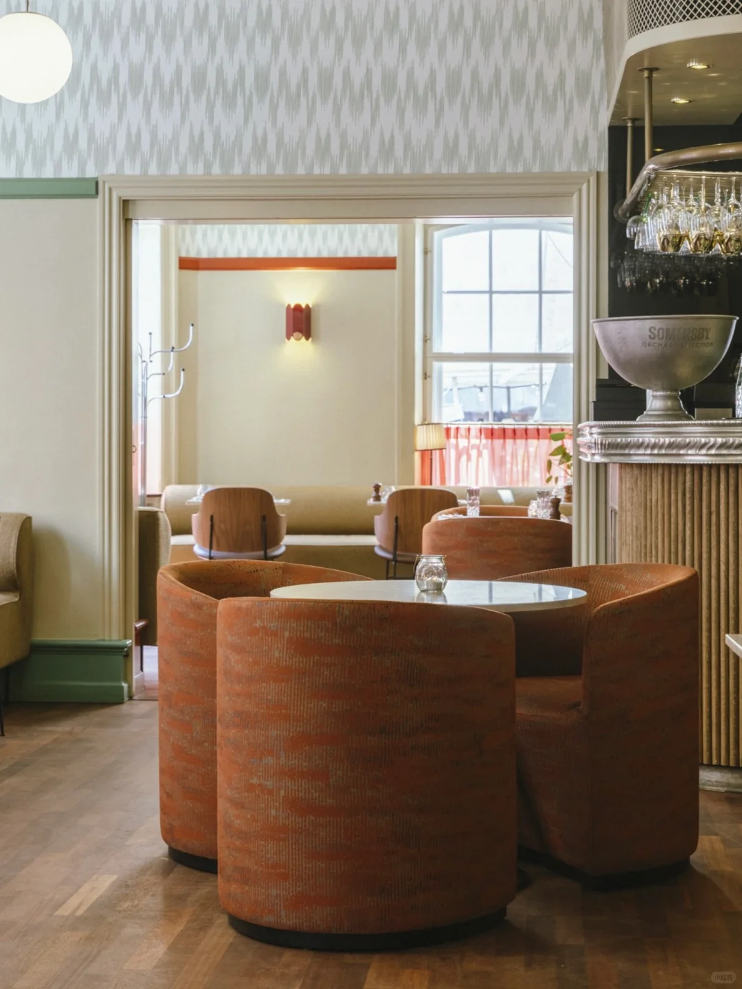 2023 年,餐厅与 All That Matters Design Studio 设计团队携手,对室内空间进行了改造。设计团队在保留古老房间细节的基础上,通过大胆的色彩运用和图案壁纸搭配,为空间注入现代气息,并精选Audo 系列餐椅,在赋予餐厅现代设计的美感同时,营造出自然静谧的氛围,尽享舒适与惬意。