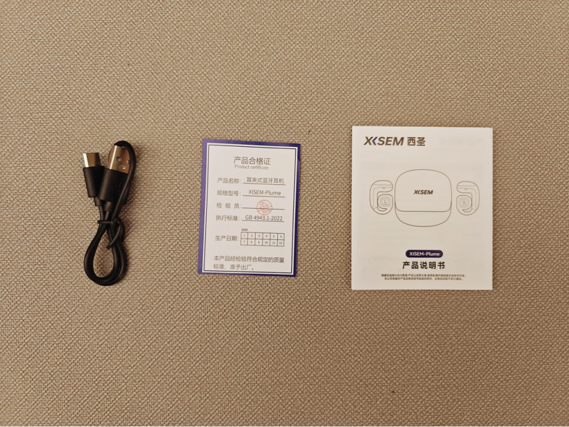 包装内包含耳机本体、说明书保修卡以及一条Type-C充电线。充电线与手机Type-C线完全兼容,这意味着外出时无需携带专用充电线,极大提升了便携性。
