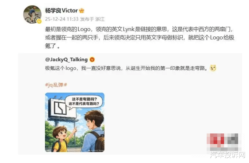 12 月 24 日消息,有博主发文分享自己对极氪 Logo 的第一印象是“走弯路”。浙江吉利控股集团高级副总裁杨学良今日就极氪 Logo 的来历、设计和发展进行了介绍: