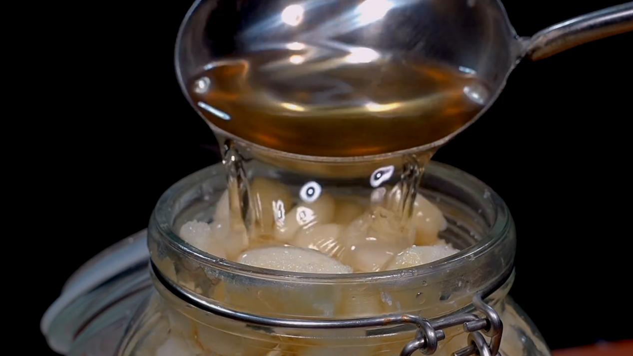 再准备一个能够密封带盖子的玻璃罐,再把我们腌制好的大蒜全部都给它放进这个玻璃罐子里面,大蒜放进来以后,然后再把放凉的米醋全部都给它放进这个罐子里面,盖上盖子放到温暖的地方腌制24个小时。这样腌制出来的大蒜就跟翡翠一样的绿。