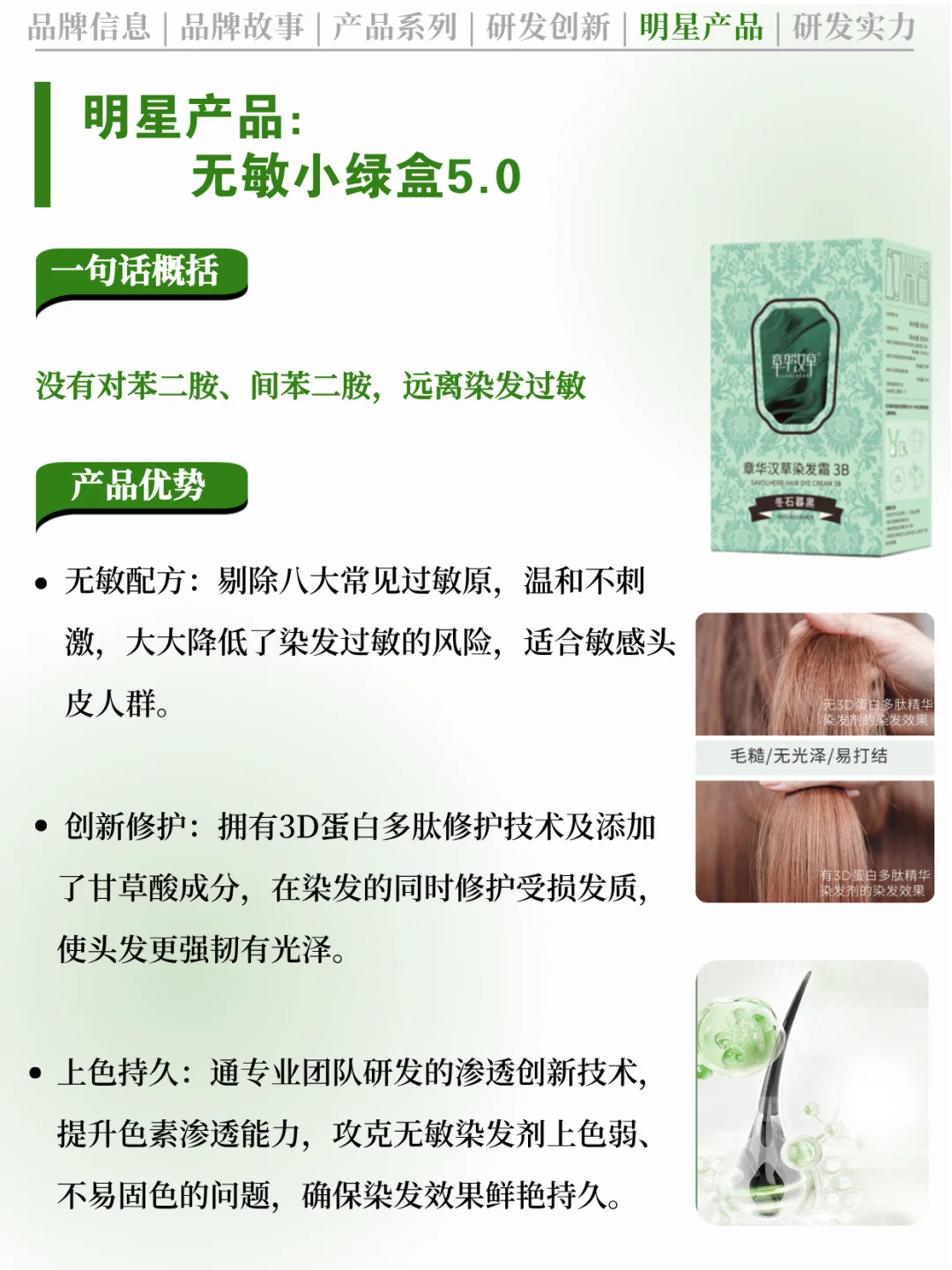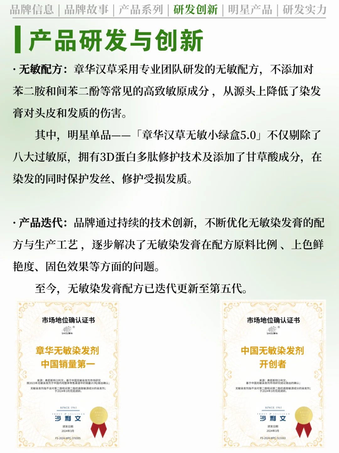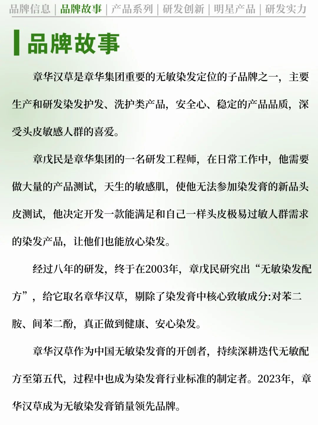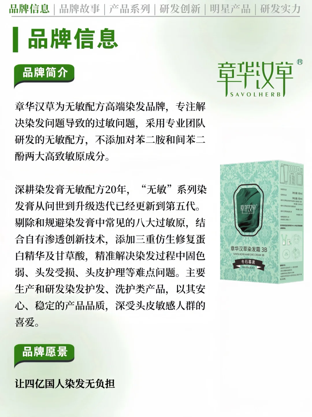 [向右R] 品牌简介:章华汉草为无敏配方高端染发品牌,专注解决染发问题导致的过敏问题,采用专业团队研发的无敏配方,不添加对苯二胺和间苯二酚两大高致敏原成分。