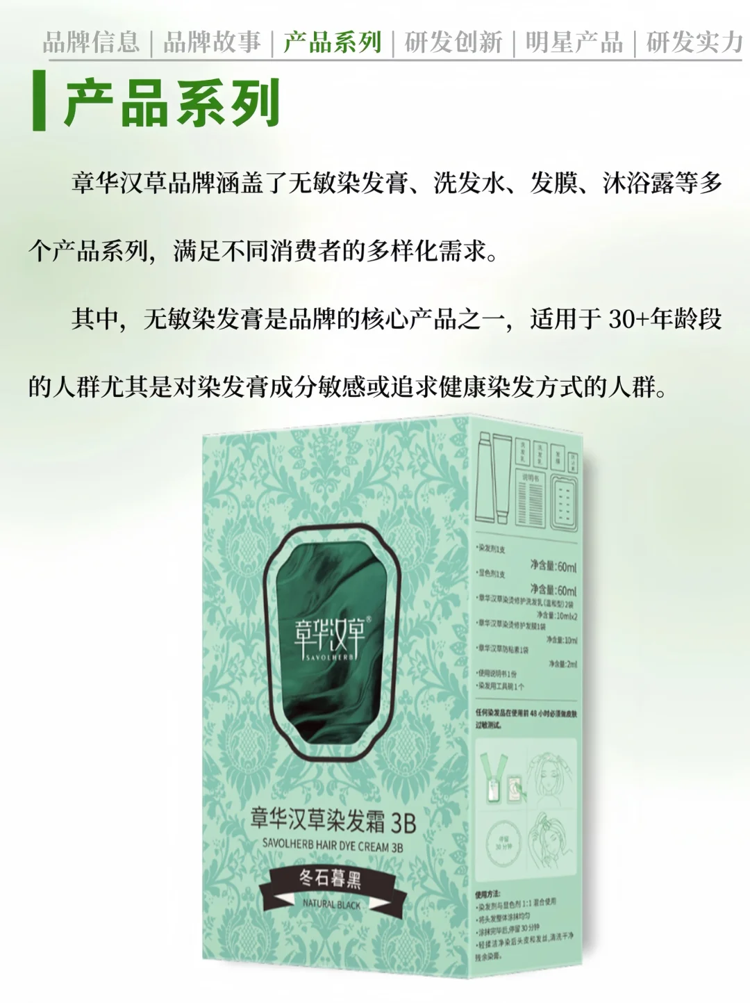 [勾引R] 产品系列:章华汉草品牌涵盖了无敏染发膏、洗发水、发膜、沐浴露等多个产品系列,满足不同消费者的多样化需求。其中,无敏染发膏是品牌的核心产品之一,适用于30+年龄段的人群尤其是对染发膏成分敏感或追求健康染发方式的人群。