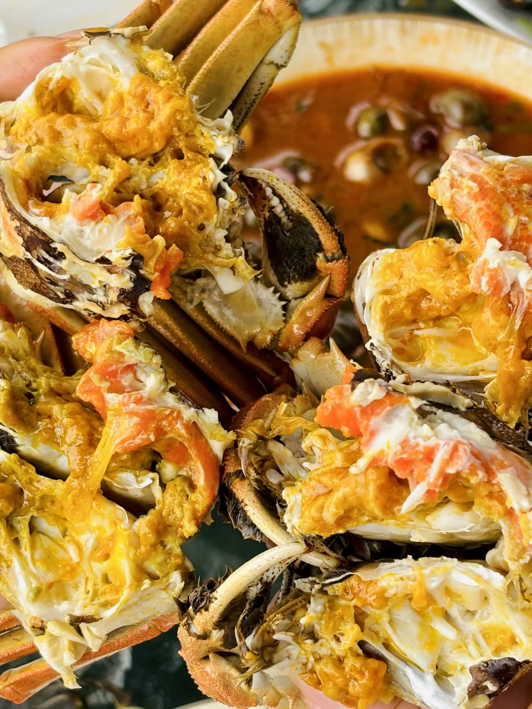 蟹黄饱满! 而且,农家乐的每一道菜都好吃 😋 比手掌还大的阳澄湖一号🦐,汤咸味美的土鸡汤🐔,肉质细嫩的白鱼🐟,鲜嫩香滑的炒鸡蛋🍳 - 这次我直接找到湖里的养殖户,现捞现选!一次吃过瘾!